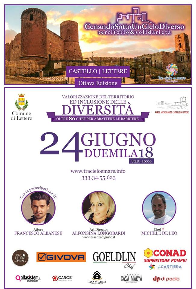 Domenica 24 giugno 2018 alle ore 20:00, si terrà l’ottava edizione “Cenando sotto un Cielo diverso” presso il Castello di Lettere, in collaborazione con l’amministrazione del Comune di Lettere ( Il Sindaco Sebastiano Giordano e l’Assessore Elvira Pentangelo) e lo staff della Sovraintendenza (L’Architetto Paola Marzullo).