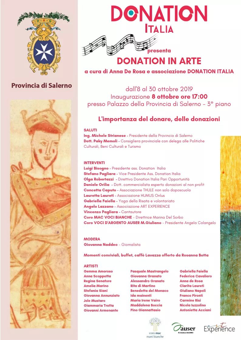 L’evento DONATION IN ARTE, a cura di Anna De Rosa per l’associazione DONATION Italia, è in programma dall’ 8 al 30 ottobre 2019 presso il Palazzo della Provincia di Salerno al 3 piano