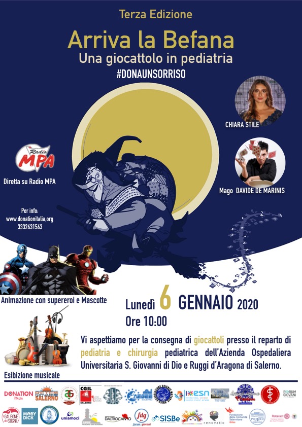 Anche quest’anno nel tradizionale giorno dell’Epifania, lunedì 6 gennaio alle ore 10.00, Donation Italia promuove con una rete di associazioni salernitane e studentesche la campagna di volontariato e solidarietà intitolata “Arriva la Befana, un giocattolo in pediatria“.