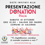 Si svolgerà sabato 19 Ottobre 2024, dalle ore 10.00, presso il Salone dei Marmi del Comune di Salerno la presentazione della nuova stagione sociale di DONATION Italia A.P.S. (www.donationItalia.org), Associazione nazionale ed Ente del Terzo Settore nata con lo scopo di promuovere la cultura del dono, intesa come fratellanza, solidarietà e rispetto dei diritti umani. Fin dalla sua fondazione, realizza iniziative a carattere sociale, sanitario e artistico-culturale, ispirandosi ai principi espressi dalla “Dichiarazione universale dei diritti umani”.