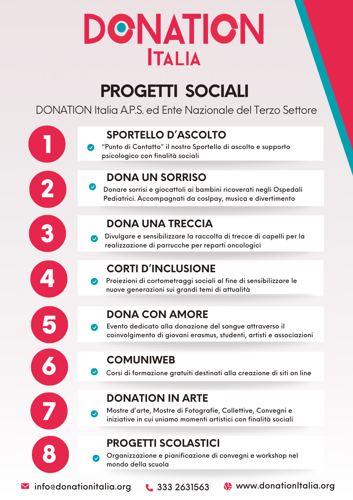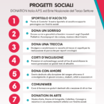 Lo Sportello D’Ascolto – Punto di Contatto; Dona Un Sorriso; Dona Una Treccia; Corti D’Inclusione; Dona con Amore; Comuniweb; Donation In Arte; Progetti Scolastici.