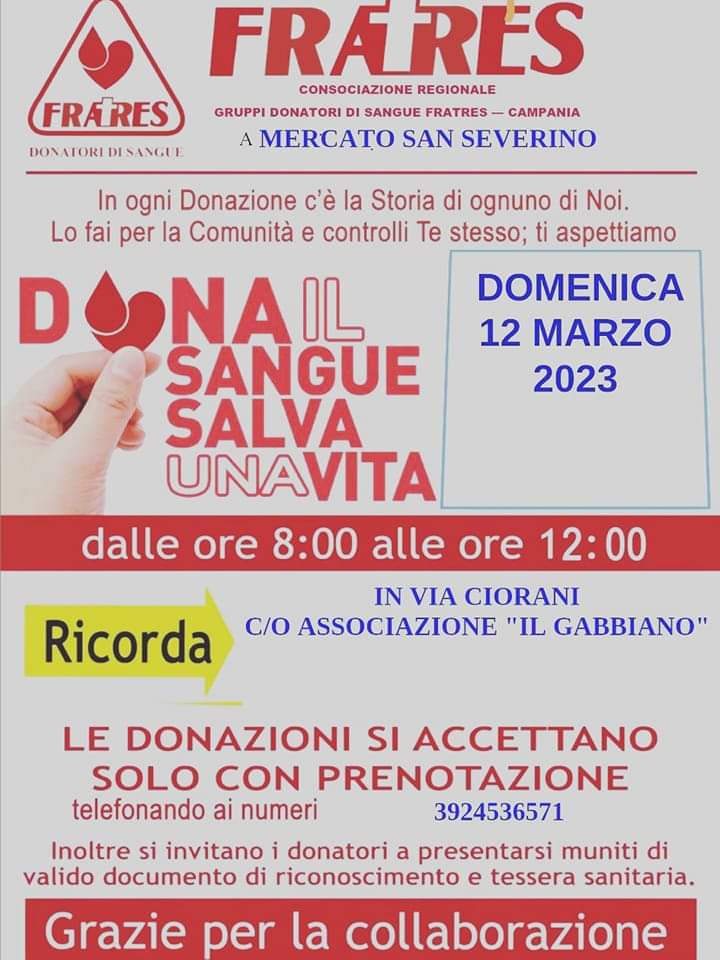 Domenica 12 marzo 2023, grazie ai Fratres ‘’Consociazione Regionale Gruppi Donatori di Sangue Campania’’, a Mercato San Severino dalle ore 8:00 alle ore 12:00, muniti di carta d’identità e tessera sanitaria, in via Ciorani C/O Associazione il Gabbiano, sarà possibile donare il sangue. Per lanciare questa campagna di sensibilizzazione, è stata realizzata una bellissima locandina .