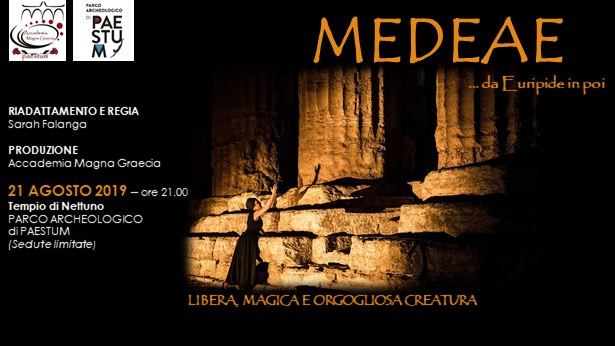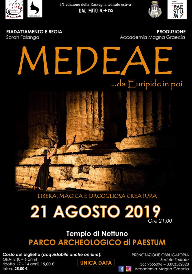 La Rassegna si concluderà con un grande classico: “MEDEAE…da Euripide in poi”, in scena ai piedi del Tempio di Nettuno, il 21 agosto 2019, alle ore 21.00. La scena è un ring entro il quale il pubblico è avvolto. Persa la dimensione abituale, rompendo la “quarta parete”, lo spettatore è al centro della vicenda, proprio come succede nell’animo di chi si trova costretto a rivivere il suo dramma ogni volta che il teatro lo chiede, o meglio ogni volta che il “dovere di catarsi” richiama l’essenza di un personaggio teatrale.