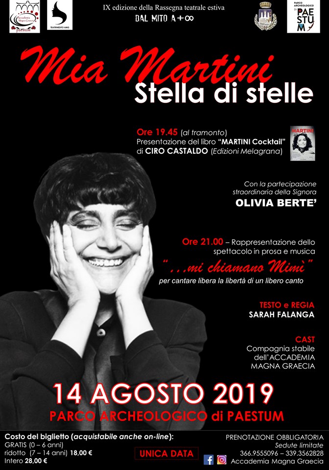 L’estate dell’Accademia Magna Graecia prosegue con l’evento più suggestivo della Rassegna, in scena il 14 agosto 2019, ai piedi del Tempio di Nettuno: “A Mia Martini…Stella di stelle”. Sarà una serata-omaggio alla stella della musica italiana, alla presenza straordinaria della sorella, la Sig.ra OLIVIA BERTE’. L’evento inizierà alle ore 19.45, al tramonto, con la presentazione del libro “MARTINI Cocktail” di CIRO CASTALDO (biografo – Edizioni Melagrana), alla presenza di giornalisti, istituzioni e degli “amici di Mimì”. La serata procederà con lo spettacolo, in prosa e musica, di Sarah Falanga “…mi chiamano Mimì”, in scena con cinque musicisti e con gli attori dell’Accademia Magna Graecia.
