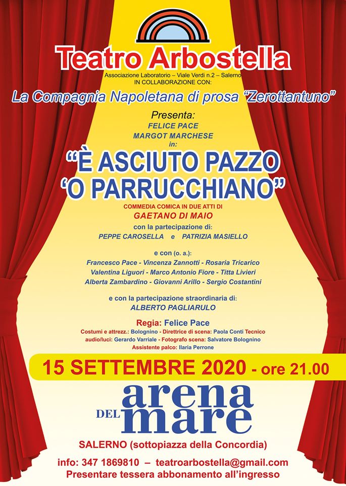 Terzo e ultimo appuntamento per il Teatro Arbostella di Salerno nel ricco cartellone dell’Arena del Mare, location prescelta dal Comune di Salerno per far ripartire il mondo dello spettacolo dopo lo stop dovuto al Coronavirus. Martedi 15 settembre ci sarà lo spettacolo della compagnia napoletana Zerottantuno che porterà in scena un divertente e celebre testo di Gaetano di Maio dal titolo “E’ asciuto pazzo o’ parrucchiano” con la regia di Felice Pace e che rientrava nel cartellone dell’Arbostella 2019/20.