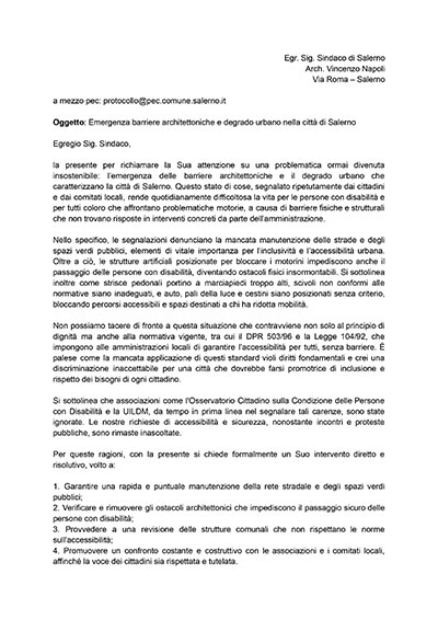 La lettera elenca una serie di criticità che affliggono la città, tra cui: