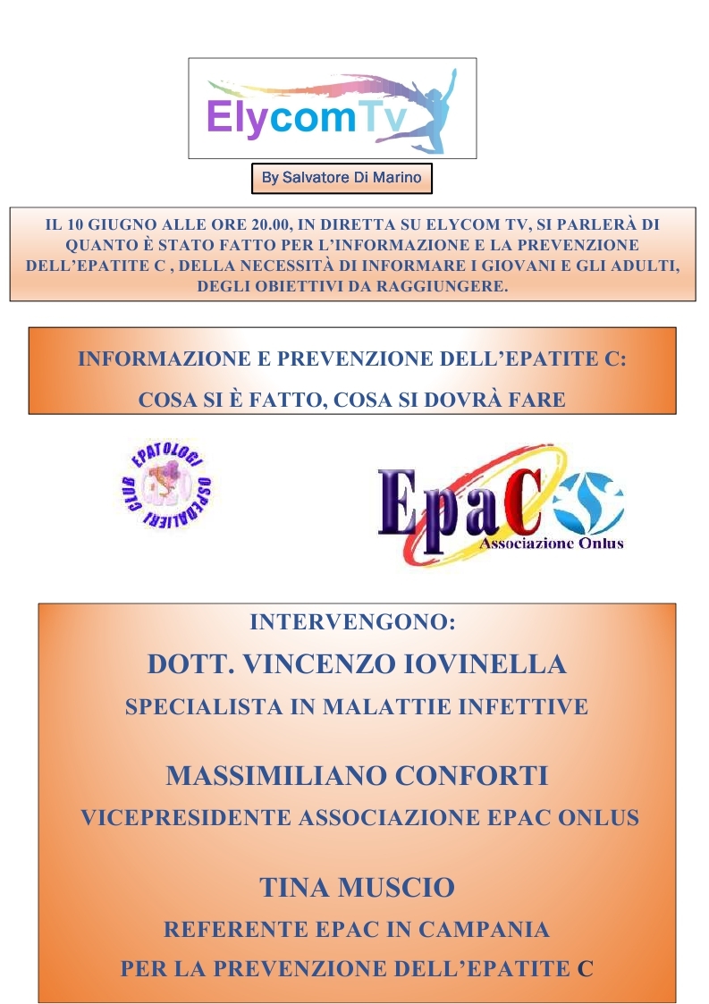 ll 10 Giugno alle ore 20,00 ,in diretta facebook su Elycom tv , si parlerà di informazione e prevenzione dell’epatite C.