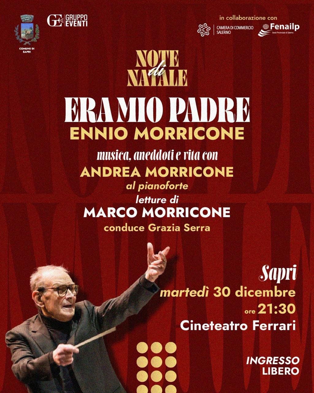 Protagonisti d’eccezione saranno Andrea Morricone, al pianoforte, e Marco Morricone che curerà le letture, offrendo al pubblico un ritratto intimo e personale del grande compositore attraverso brani tratti dal suo libro “Ennio Morricone. Il genio, l’uomo, il padre”.