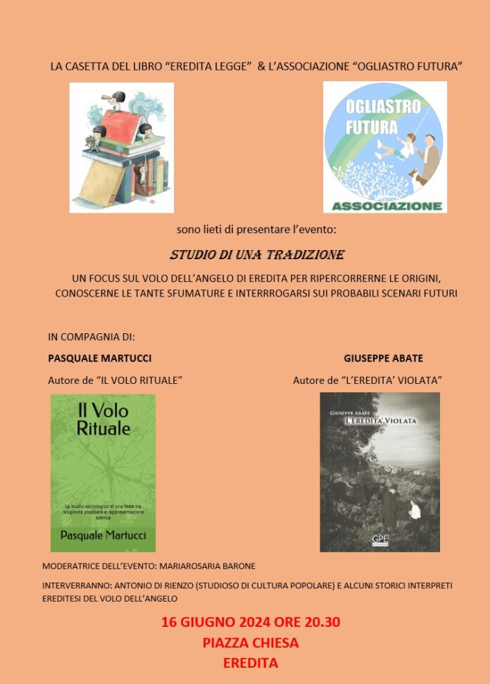 Parteciperanno gli autori dei libri: “Il volo rituale” di Pasquale Martucci e “L’eredità violata” di Giuseppe Abate.
