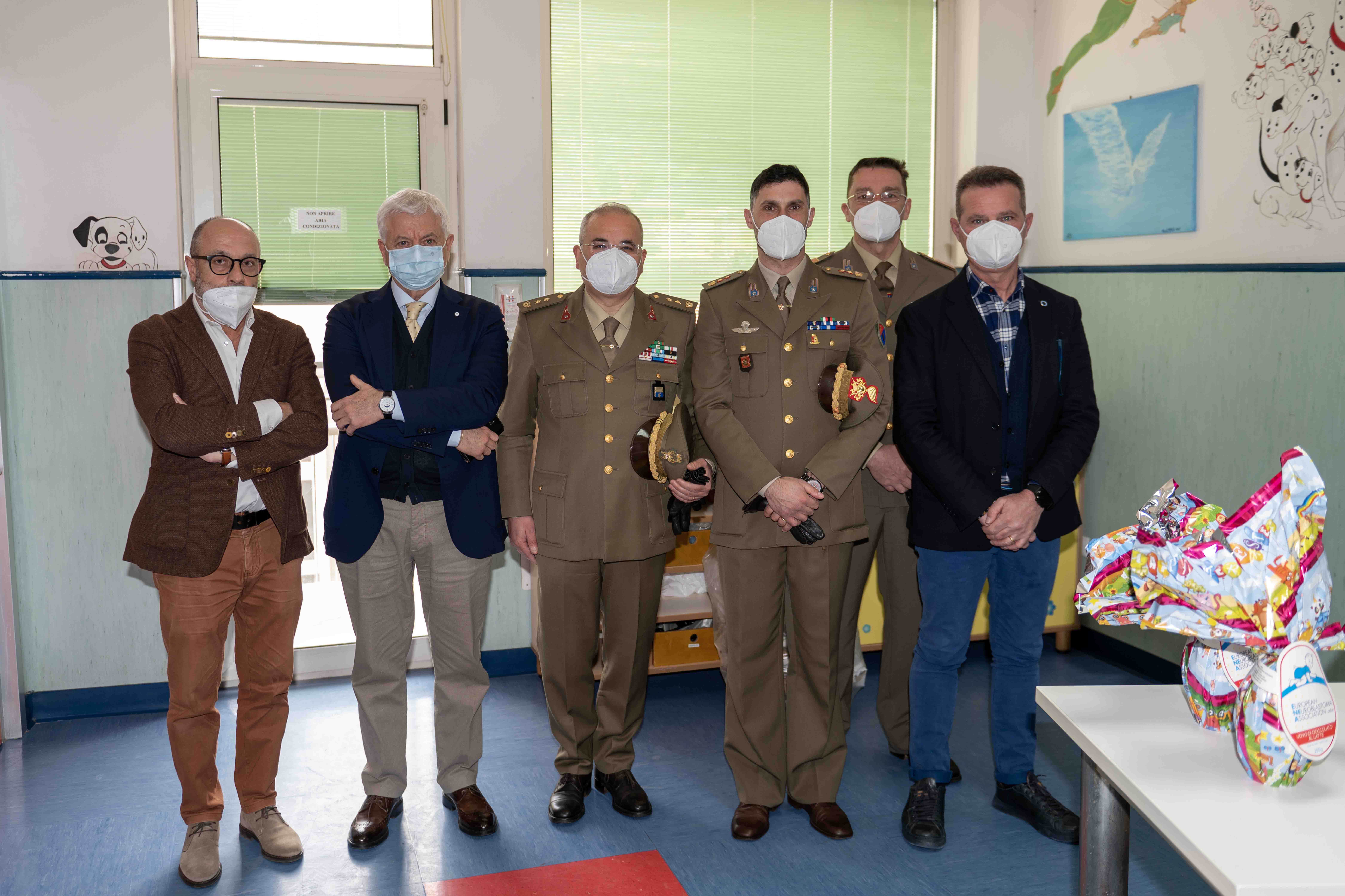 Home Esercito, i militari del battaglione Vulture di Nocera visitano e donano le uova di Pasqua ai bambini ricoverati. Il direttore sanitario D'Ambrosio, il direttore amministrativo Memoli, il comandante Carluccio, l'ufficiale medico Sorrentino