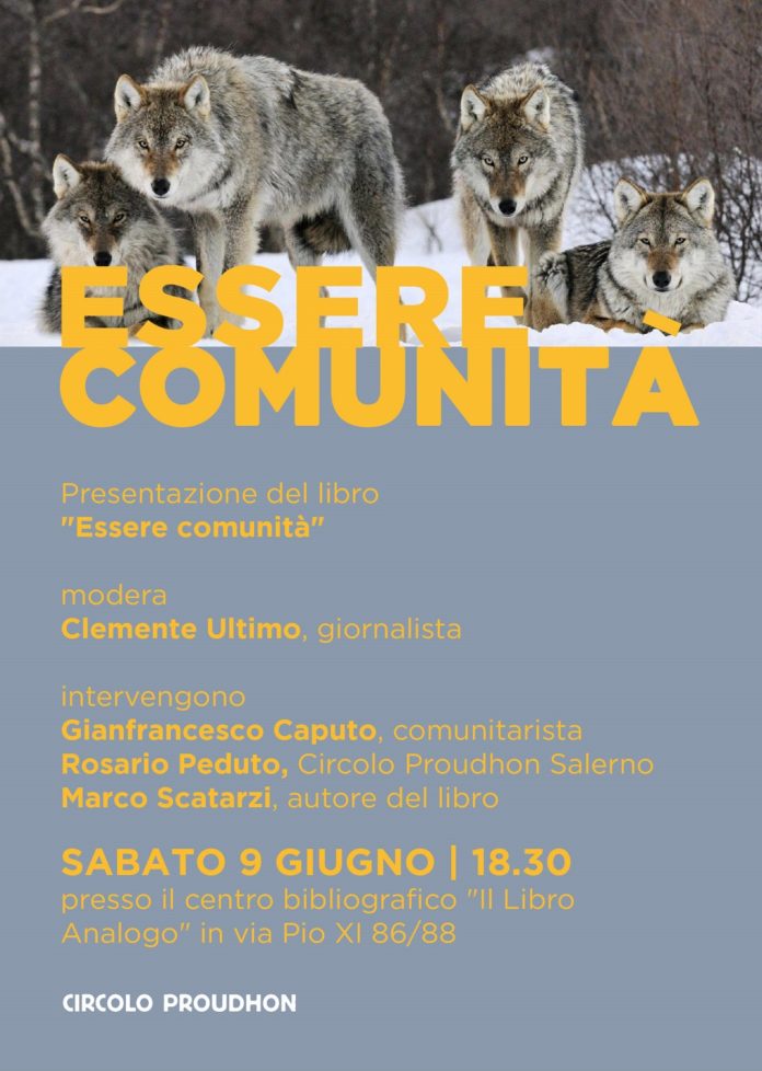 Si terrà sabato 9 giugno alle ore 18 30 presso il centro bibliografico “Il Libro Analogo” in via Pio XI 86/88 la presentazione del libro “Essere comunità” (Passaggio al Bosco edizioni) organizzata dal Circolo Proudhon Salerno. All’evento, moderato dal giornalista Clemente Ultimo, interverranno: il comunitarista e già autore del saggio “Comunità e società del consumo” Gianfrancesco Caputo, il membro del circolo di lettori salernitano Rosario Peduto e l’autore del libro Marco Scatarzi.