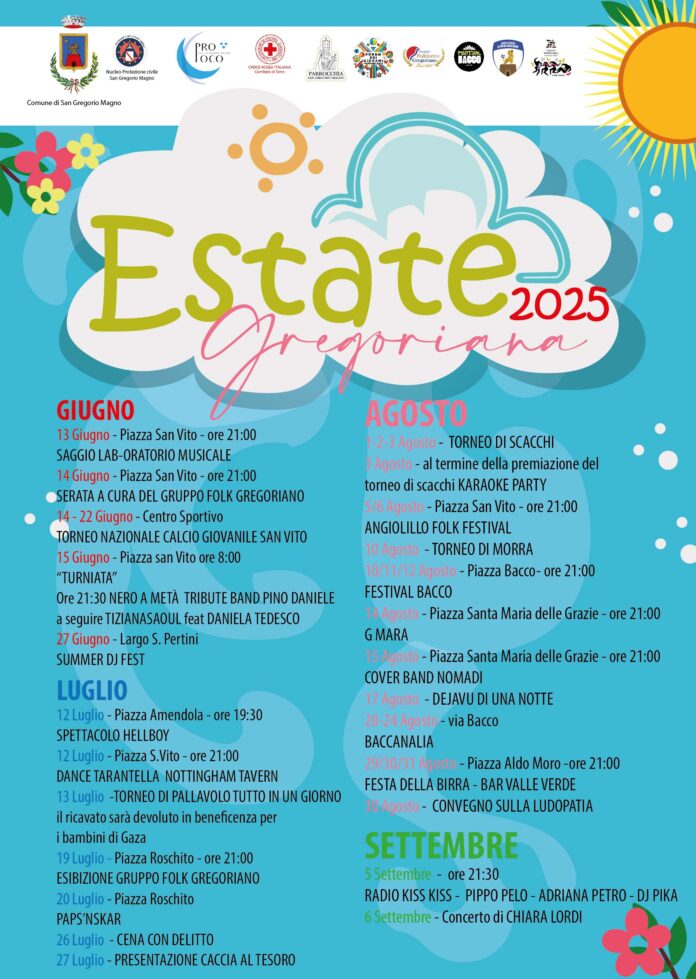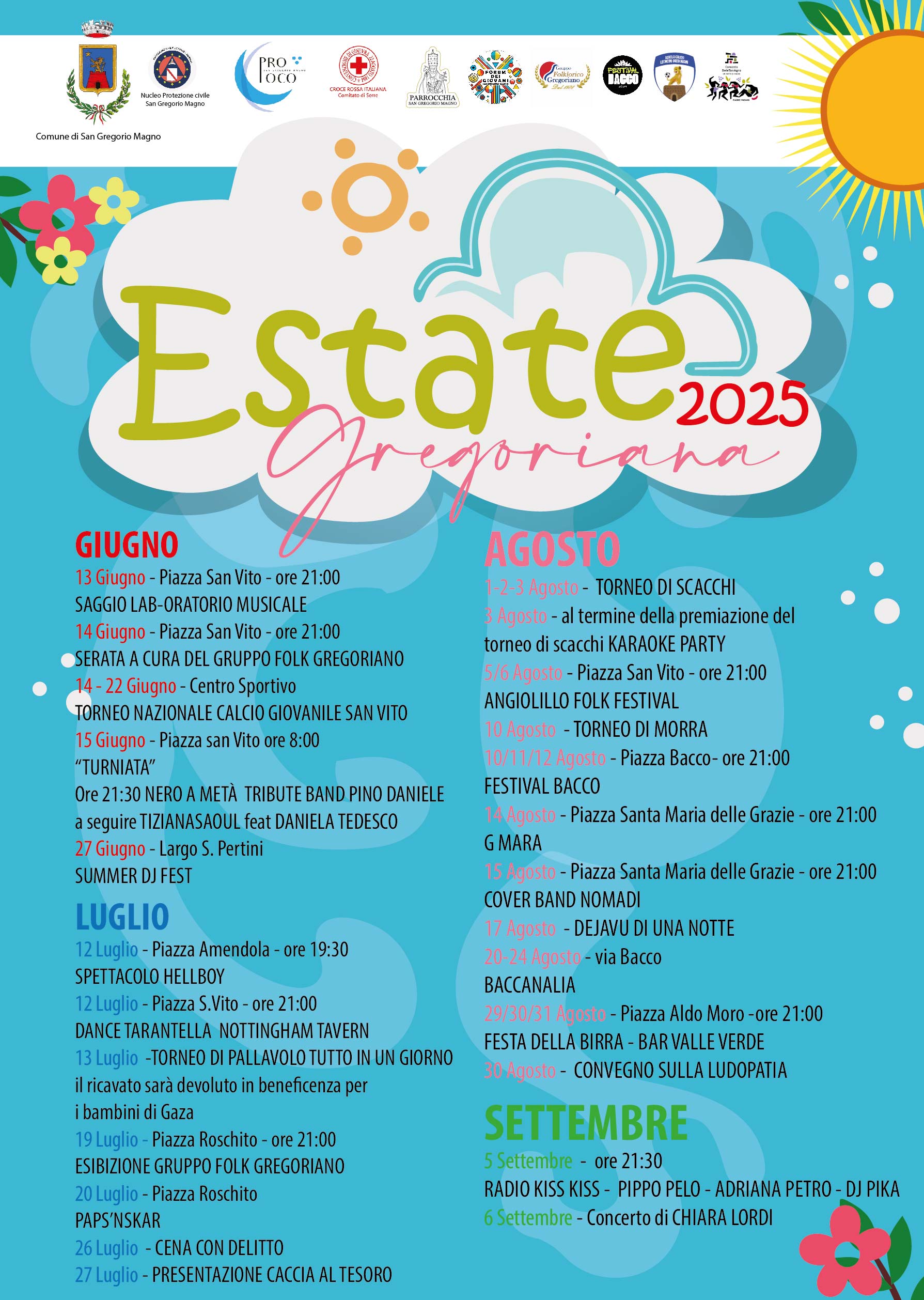 Il calendario dell’Estate Gregoriana è ricco di appuntamenti ed alcuni sono ancora in via di definizione, per cui ci potrebbero essere dei cambiamenti che saranno prontamente resi noti.
