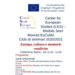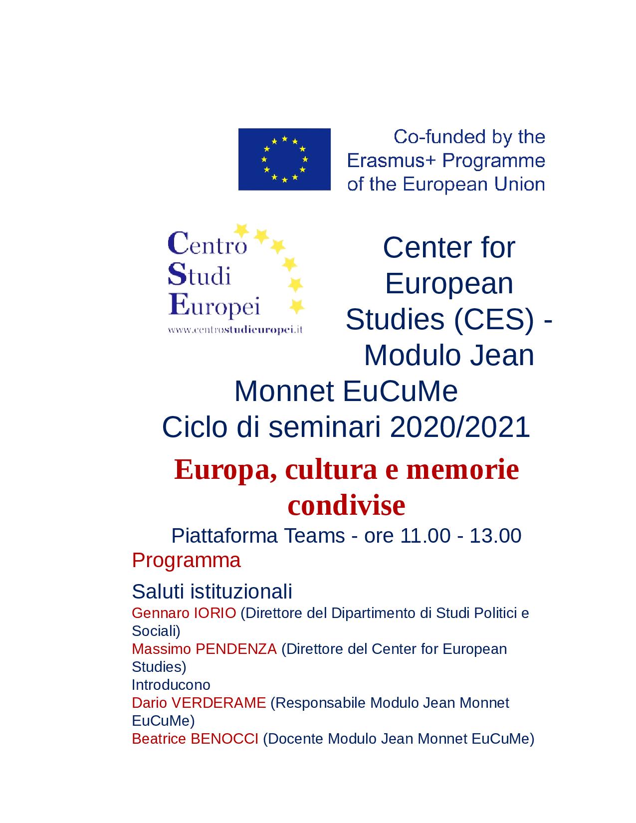 Al via, il prossimo 30 aprile 2021, il Ciclo di seminari “Europa, cultura e memorie condivise”, organizzati nell’ambito delle attività del Modulo Jean Monnet “European Culture and Memories: EU’s Strategies and Policy Developments” (EuCuMe), di cui è Coordinatore il Prof. Dario Verderame. Il Modulo Jean Monnet è cofinanziato dall’Unione Europea per il triennio 2018-2021, nell’ambito del Programma “Erasmus Plus – Jean Monnet Activities”.
