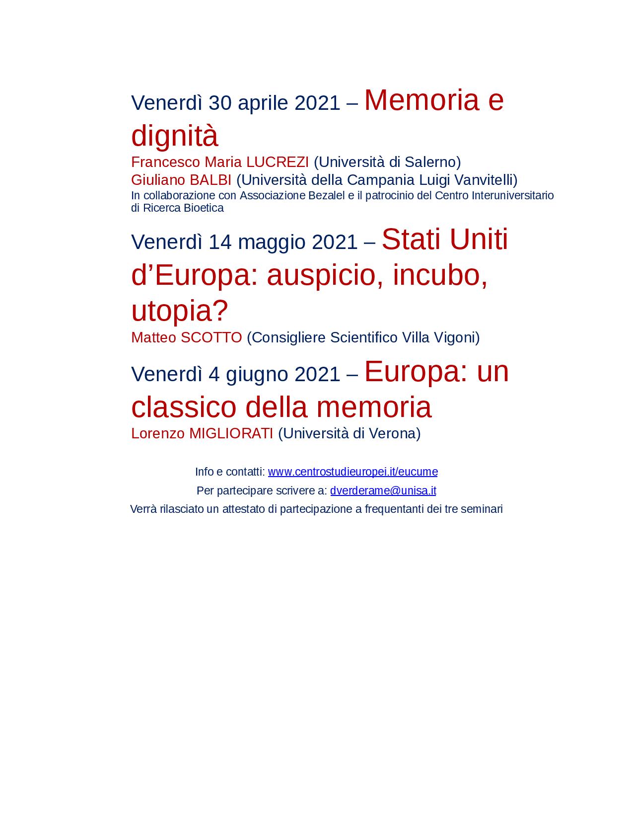 Il 30 aprile, in collaborazione con l’Ass. Bezalel e il patrocinio della CIRB, Francesco Maria Lucrezi (Università di Salerno) e Giuliano Balbi (Università della Campania Luigi Vanvitelli) parleranno di “Memoria e Dignità”, il 14 maggio Matteo Scotto (Consigliere Scientifico Villa Vigoni) tratterà il tema “Stati Uniti d’Europa: auspicio, incubo, utopia?” e, infine, il 4 giugno Lorenzo Migliorati (Università di Verona) proporrà “Europa: un classico della memoria”. Per i saluti saranno presenti Gennaro Iorio, Direttore del DiSPS, e Massimo Pendenza, Direttore del Centro Studi Europei. Introducono i seminari Dario Verderame, Coordinatore del Modulo JM Eucume e Beatrice Benocci, Docente del Modulo JM Eucume.