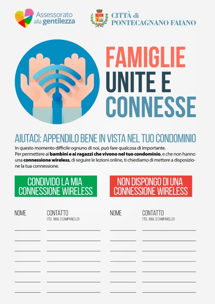 Il Comune di Pontecagnano Faiano lancia l’iniziativa Famiglie Connesse, che invita i cittadini che ne dispongono a condividere la propria connessione wireless affinchè anche chi non ne ha una possa utilizzarla in questo momento difficile.