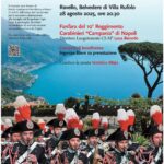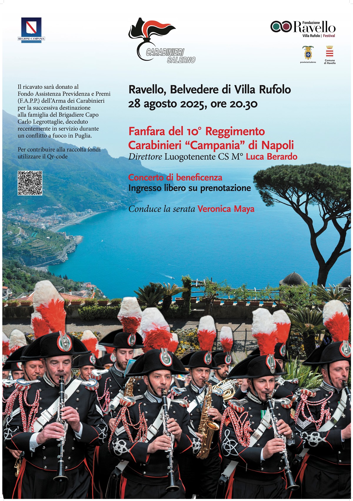 La Fanfara del 10° Reggimento Carabinieri “Campania” Napoli è da sempre testimone del valore identitario e comunitario della musica, che accompagna le cerimonie istituzionali e allo stesso tempo incontra il pubblico nelle piazze, nelle scuole, nei teatri. La sua presenza a Ravello sottolinea il legame tra l’Arma e il territorio, in un contesto di grande prestigio artistico e culturale. Il concerto ha inoltre una finalità benefica: chi vorrà potrà effettuare una donazione al Fondo Assistenza Previdenza e Premi (F.A.P.P.) dell’Arma dei Carabinieri che destinerà la somma raccolta alla famiglia del Brigadiere Capo Carlo Legrottaglie, deceduto recentemente in servizio durante un conflitto a fuoco in Puglia.