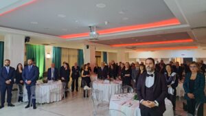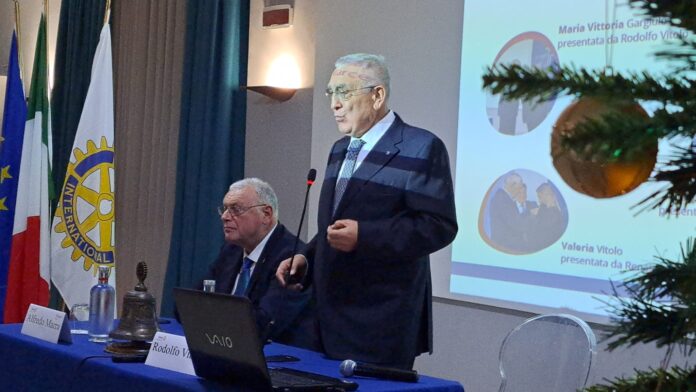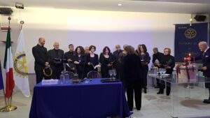 Il professor Vitolo, dopo aver tracciato un bilancio delle tante attività svolte nella prima parte dell’anno sociale, ha anche annunciato che, su proposta del “ Rotary Club Salerno Est”, il “Distretto Rotary 2101” , l’Ente Camerale e l’Università degli Studi di Salerno, sosterranno il progetto “Italia Langobardorum”, che prevede anche l’organizzazione, curata dal dottor Igino De Giorgi, socio del Club, di un convegno , il 12 e 13 gennaio, che richiami l’attenzione sulle possibilità di inserire Salerno nel sito seriale UNESCO Italia Langobardorum. “Il convegno si articolerà su due livelli di comunicazione: uno di carattere più propriamente sociale, volto alla conoscenza di Salerno medievale, l’altro più specialistico, con relazioni volte ad approfondire le vicende di alcune città longobarde e una tavola rotonda dove docenti universitari protagonisti del progetto “Italia Langobardorum” si confronteranno con esperti del tema e attori istituzionali del territorio”. Il presidente Vitolo ha anche ricordato che il Club ha partecipato a un bando per l’alta formazione. L’Assistente del Governatore Alfredo Marra ha portato i saluti del Governatore del “Distretto Rotary 2101” Alessandro Castagnaro e spiegato che:” Il Rotary è l’antidoto ai momenti che stiamo vivendo e noi dobbiamo esserne gli ambasciatori nella società per diffonderne i valori”. La serata è stata animata dallo showman salernitano Riccardo Conforti alias “Riccardo The Voice”, cantante, attore, trasformista: un artista poliedrico che ha partecipato anche al programma di Rai1 “Domenica in”, come sosia di Renato Zero e Pino Daniele. Interpretando proprio la canzone del cantante napoletano, “Na’ tazzulella e’ cafè”, è stato vincitore del programma televisivo di Canale 5 “Super Karaoke” con Fiorello nella puntata che fu organizzata a Salerno, in Piazza della Concordia. Riccardo ha anche partecipato al programma “Re per una notte”, condotto da Gigi Sabani, e al programma “Cultura Moderna”, su Canale 5, condotto da Teo Mammuccari, dove imitava i personaggi di Vasco Rossi e Renato Zero. E’ stato anche uno dei protagonisti dello spettacolo “The full monty” con la regia di Gigi Proietti al “Teatro Brancaccio” di Roma. Durante la serata Riccardo ha entusiasmato tutti presenti imitando e cantando le canzoni di vari personaggi come Franco Califano, Pino Daniele, Renato Zero e Vasco Rossi. Prima del taglio del panettone si sono esibiti i componenti del “Coro Casella”, diretto dal Maestro Caterina Squillace, che hanno creato una magica atmosfera interpretando alcuni famosi canti natalizi come “Jingle Bells” e “ Bianco Natale”.