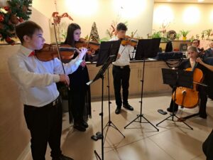 E’ iniziata con l’incalzante melodia del coinvolgente ed emozionante brano natalizio “Carol of the Bells” , eseguito dal quartetto d’archi composto da tre violinisti e una violoncellista: Francesco Villari, Alessandra Catalano, Alessandro Fasolino e Francesca Fasolino, studenti del Conservatorio Martucci di Salerno, la tradizionale “Festa degli Auguri” del “Rotary Club Salerno Nord dei Due Principati”, presieduto dal professor Antonino Sessa, tenutasi presso la grande sala del “San Severino Park Hotel” di Mercato San Severino. A presentare i quattro musicisti salernitani, che hanno eseguito, oltre ai tradizionali brani natalizi, brani classici, come la “Cantata di Bach”, e brani tratti dal “Concerto fatto per la Notte di Natale” di Arcangelo Corelli, è stato il Prefetto del Club, Vittorio Villari.