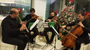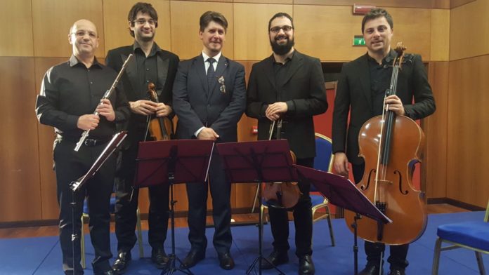 La serata è iniziata con l’esibizione, nel grande Auditorium della struttura alberghiera, del “Real Quartetto di Napoli” che con Franco Vigorito al flauto traverso, Giuseppe Carotenuto al violino, Francesco Venga alla viola e Matteo Parisi al violoncello, hanno eseguito il concerto:”…da Napoli a Vienna” eseguendo brani molto impegnativi, di notevole difficoltà esecutiva, scritti da Domenico Cimarosa, Gioacchino Rossini, Mozart e alcuni brani classici napoletani.