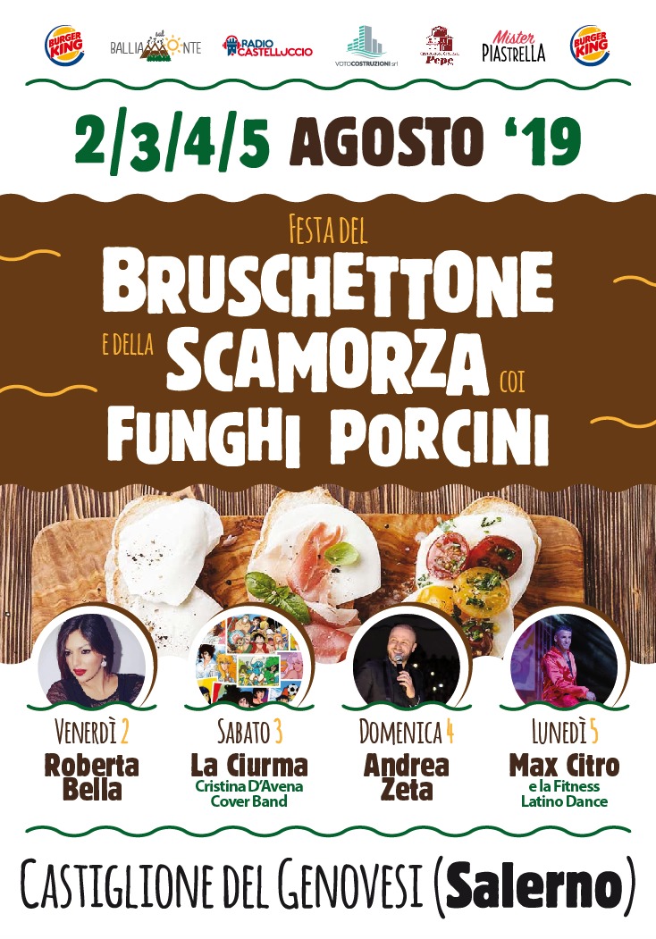 Tutto pronto per la terza edizione della Festa del Bruschettone e della scamorza coi funghi porcini, in programma da venerdì 2 a lunedì 5 agosto a Castiglione del Genovesi (SA). Quattro giorni di Festa, ideata dai giovani dell’Associazione Culturale Balliamo Sul Monte, che uniranno gusto e tradizione. Gli ingredienti sono i prodotti tipici dei Monti Picentini, come i funghi porcini, aria fresca e tanto divertimento. Il menù prevede i bruschettoni (per tutti i gusti) e le specialità (scamorza ai porcini e caciocavallo impiccato). Novità di quest’anno il tegamino con pane cotto. L’intrattenimento è per tutte le età. Ecco il programma delle serate: