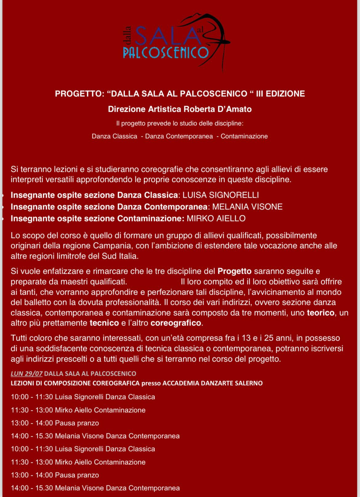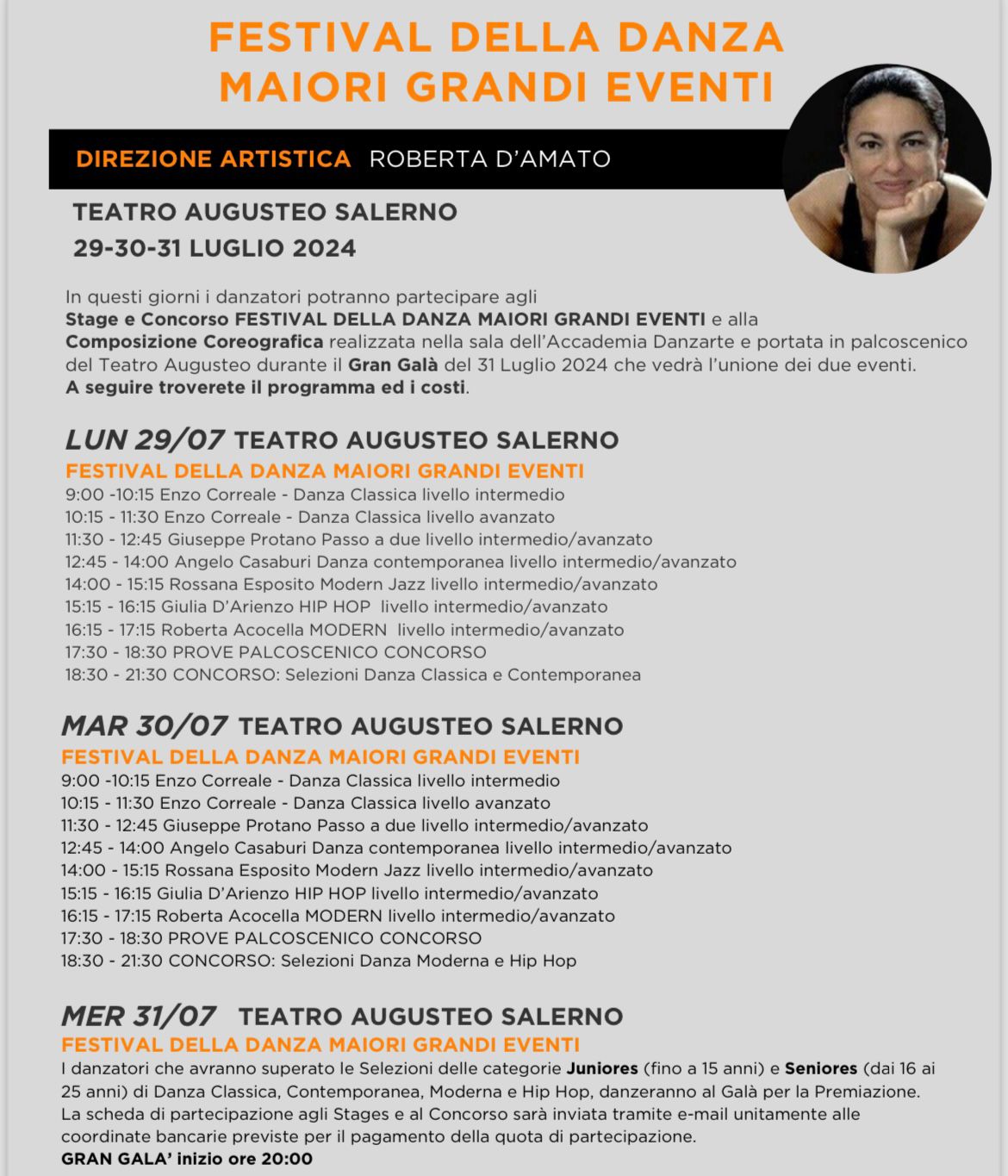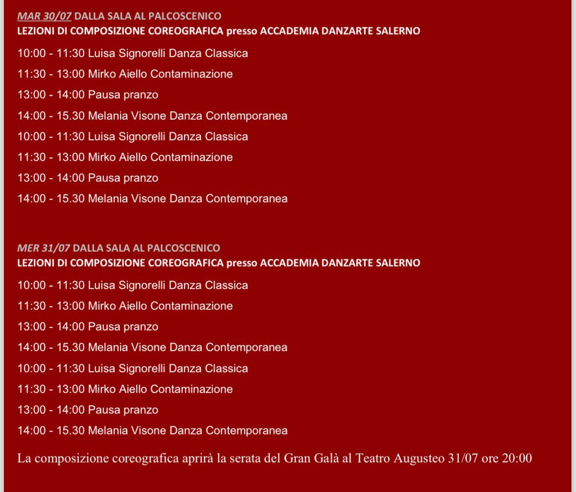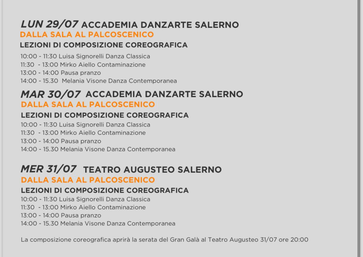 In questi giorni i danzatori potranno partecipare agli Stage e Concorso FESTIVAL DELLA DANZA MAIORI GRANDI EVENTI e alla Composizione Coreografica realizzata nella sala dell’Accademia Danzarte e portata in palcoscenico del Teatro Augusteo durante il Gran Galà del 31 Luglio 2024 che vedrà l’unione dei due eventi!