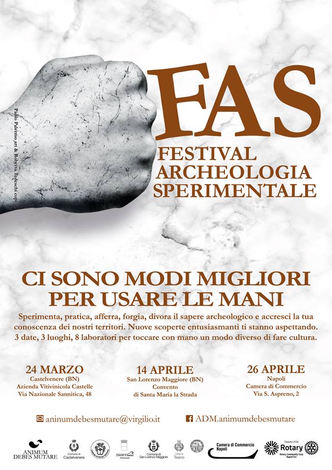Storia ed archeologia sono la chiave di lettura consapevole dei “nostri territori”. Giovedì 26 aprile 2018 si terrà il terzo appuntamento di FAS – Festival di Archeologia Sperimentale – ideato e curato dall’Associazione culturale ANIMUM DEBES MUTARE, dalle 10:00 alle 13:30 e dalle 16:00 alle 18:30 nel Palazzo della Borsa presso la CCIAA di Napoli, ingresso in Via S. Aspreno n.2 nelle Sala della Contrattazione al piano terra e Sala Convegni al II piano.
