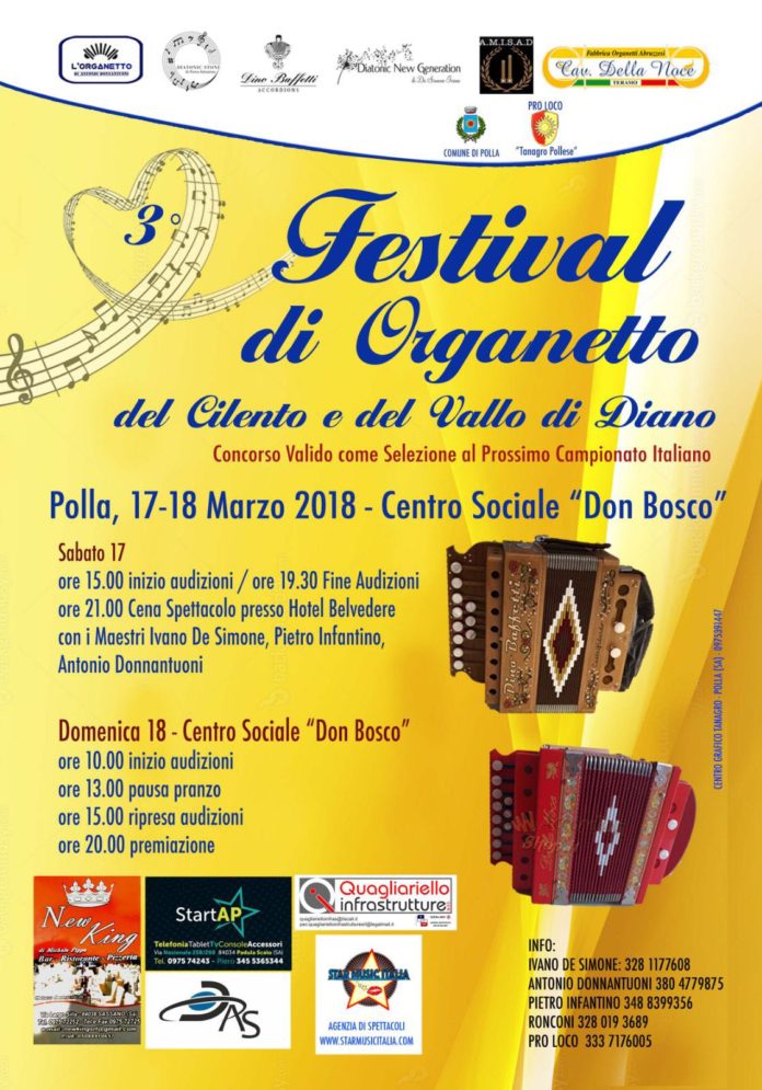 Tutto pronto a Polla per la terza edizione del Festival di organetto del Cilento e Vallo di Diano, in programma presso il Centro Sociale “Don Bosco” il 17 e 18 marzo. Si tratta di un concorso valido come selezione al prossimo campionato italiano. Giunto alla terza edizione, l’evento gode del patrocinio del comune di Polla e della Proloco Tanagro pollese.