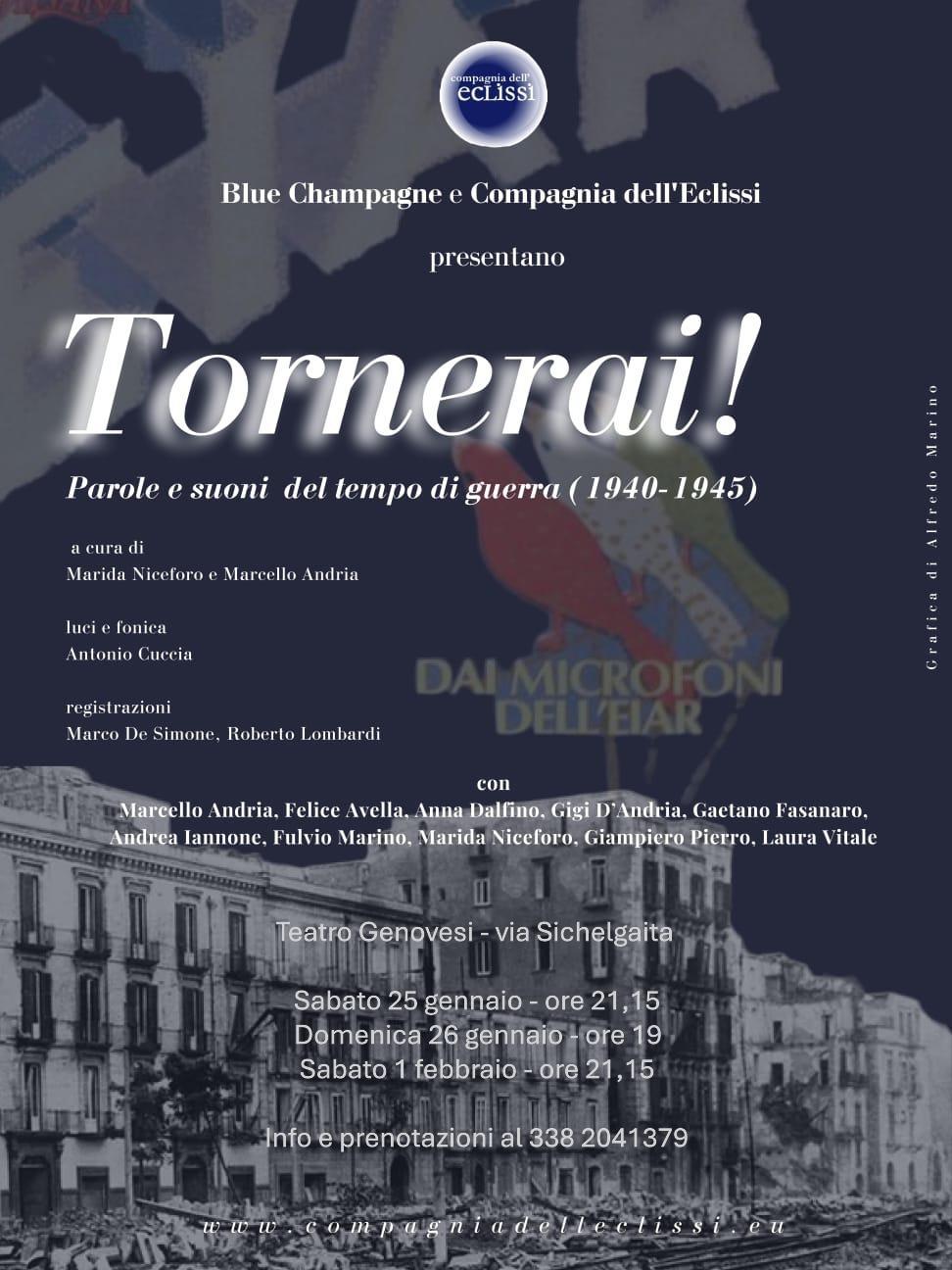 Sabato 25 gennaio alle ore 21.15, domenica 26 gennaio alle ore 19.00 e sabato 1° febbraio alle ore 21.15, al Teatro Genovesi andrà in scena “Tornerai!”, un emozionante viaggio attraverso parole e musiche del periodo bellico 1940-1945. Lo spettacolo, curato da Marida Niceforo e Marcello Andria, è un omaggio alla memoria e alla resilienza umana attraverso testi e melodie dell’epoca. Le luci e il suono sono di Antonio Cuccia, mentre le registrazioni sono a cura di Marco De Simone e Roberto Lombardi. Il cast: Marcello Andria, Felice Avella, Anna Dalfino, Gigi D’Andria, Gaetano Fasanaro, Andrea Iannone, Fulvio Marino, Marida Niceforo, Giampiero Pierro e Laura Vitale.