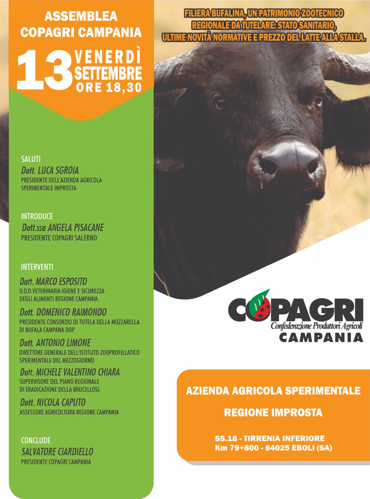 All’incontro, dopo i saluti del dottor Luca Sgroia, presidente dell’azienda agricola sperimentale Improsta, e l’introduzione della dottoressa Angela Pisacane, presidente Copagri Salerno , interverranno il dottor Marco Esposito, U.O.D. Veterinaria igiene e sicurezza degli alimenti regione Campania, il dottor Domenico Raimondo presidente del consorzio di tutela della mozzarella di bufala campana DOP, il dottor Antonio Limone direttore generale dell’istituto zooprofilattico sperimentale del mezzogiorno, il dottor Michele Valentino Chiara supervisore del piano regionale di eradicazione della brucellosi, il dottor Nicola Caputo assessore agricoltura regione Campania. conclude gli interventi Salvatore Ciardiello presidente Copagri Campania.
