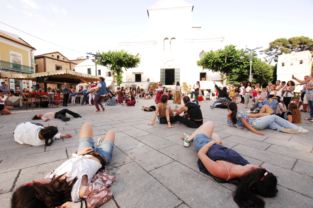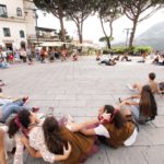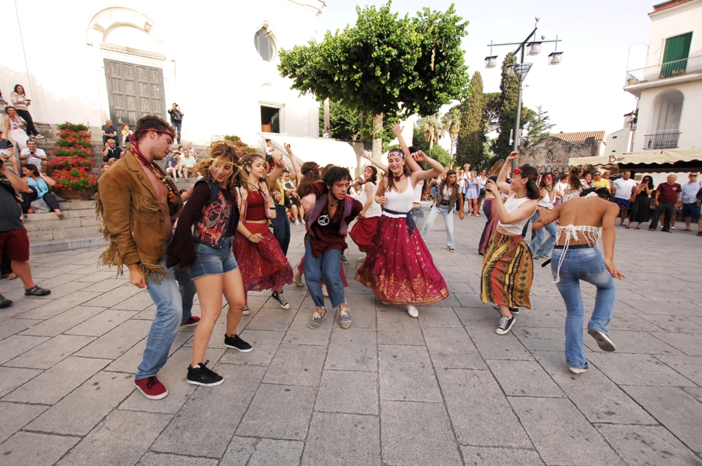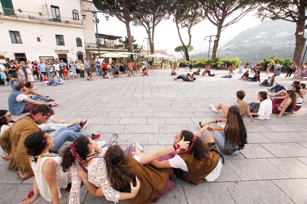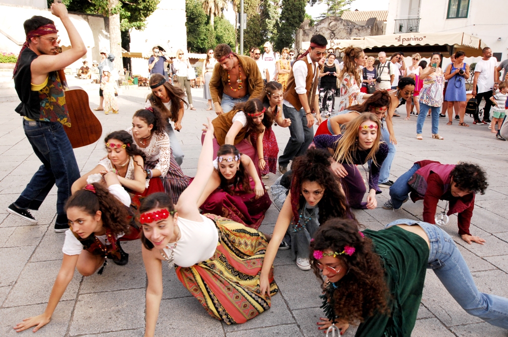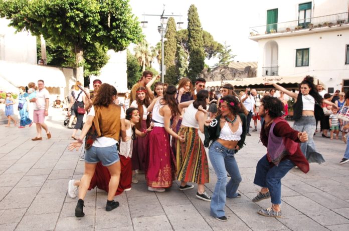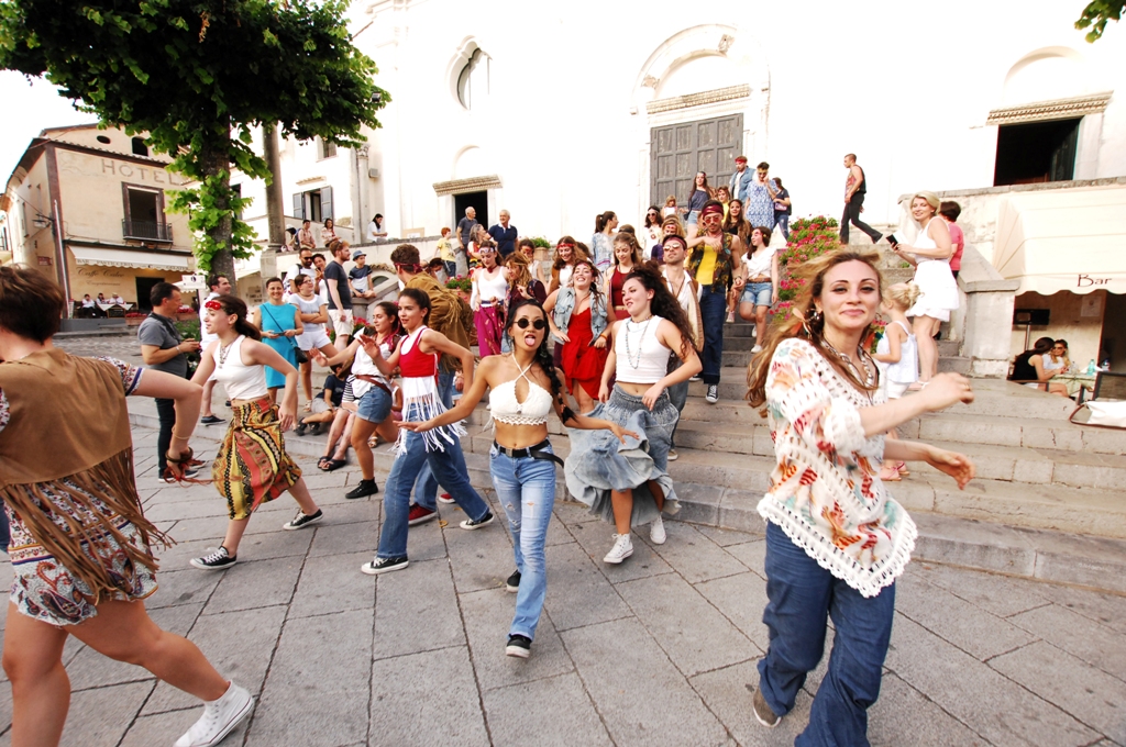 Happening a Ravello. Decine di ragazzi e ragazzi hanno invaso le scale della cattedrale e piazza Duomo ballando al suono delle musiche cult del 68 nell’ atto performativo dal titolo “1968: see me, feel me”.