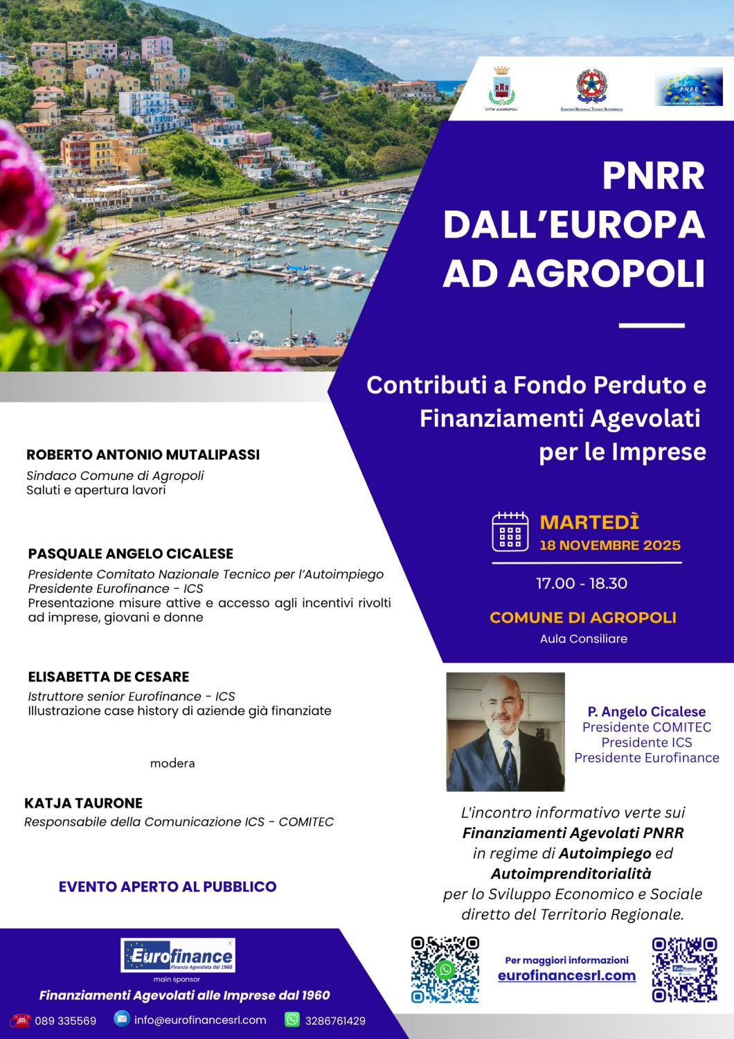 Il prossimo 18 novembre, a partire dalle ore 17.00 presso l’aula Consiliare del Comune di Agropoli si terrà, a cura del Comitato Nazionale Tecnico per l’Autoimpiego (COMITEC), il convegno “PNRR dall’Europa ad Agropoli. Contributo a Fondo Perduto e Finanziamenti Agevolati per le Imprese” atto a presentare le tante e variegate possibilità offerte dagli incentivi finanziari di Stato in termini di crescita e di sviluppo socio-economico imprenditoriale.