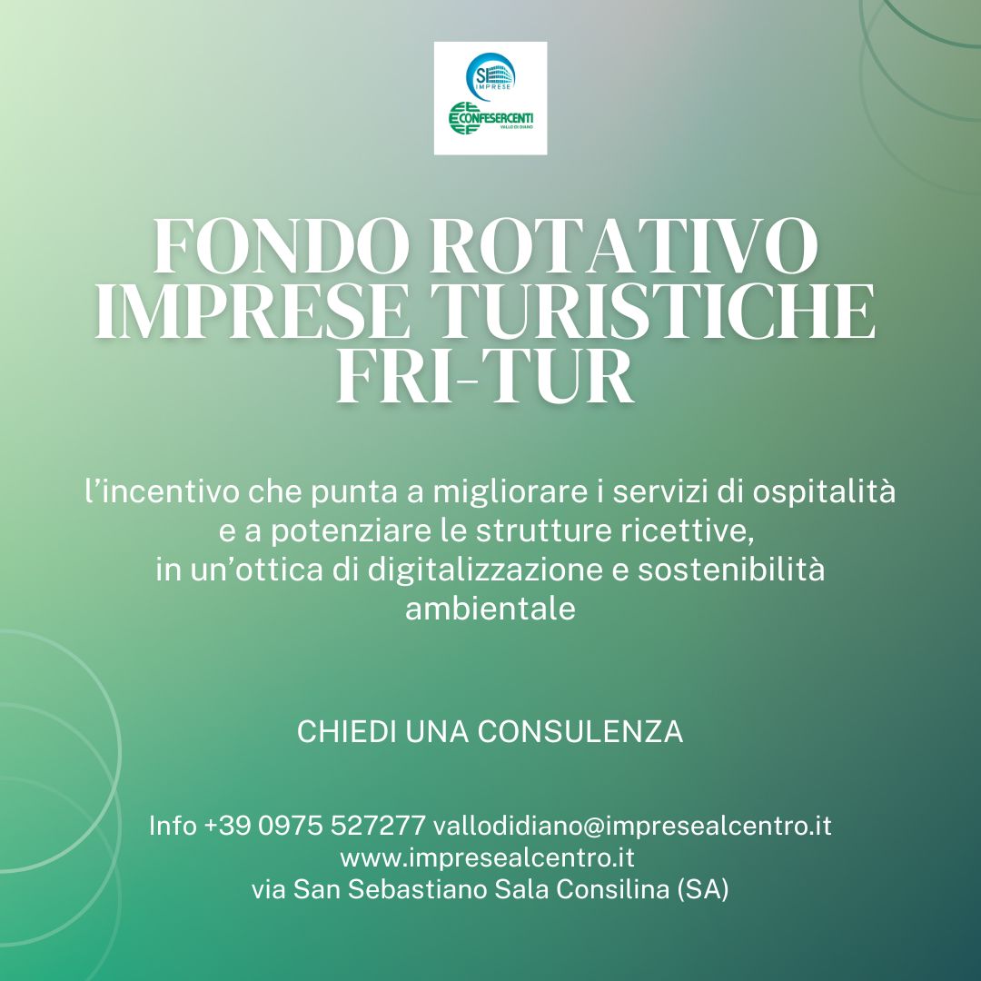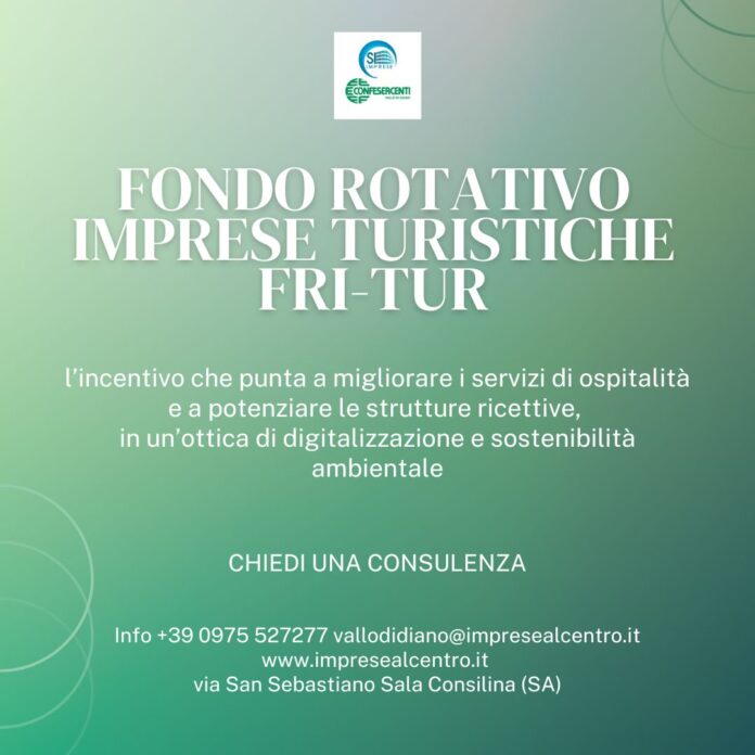 La Confesercenti Vallo di Diano, guidata dalla dottoressa Maria Antonietta Aquino, informa su FRI-Tur, l’incentivo che punta a migliorare i servizi di ospitalità e a potenziare le strutture ricettive, in un’ottica di digitalizzazione e sostenibilità ambientale.