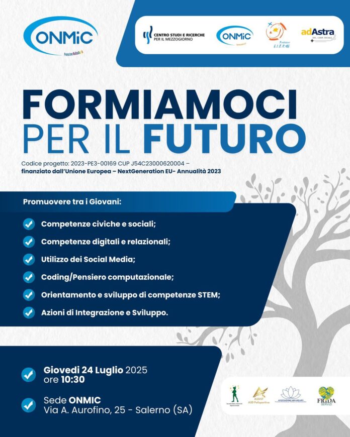 Giovedì 24 luglio alle ore 10.30, presso la sede dell’ONMIC in via A. Aurofino 25 a Salerno, si terrà la conferenza stampa di presentazione della seconda annualità del progetto “Formiamoci per il futuro” (Codice progetto: 2023-PE3-00169 – CUP J54C23000620004), finanziato dall’Unione Europea – Next Generation EU – annualità 2023.