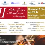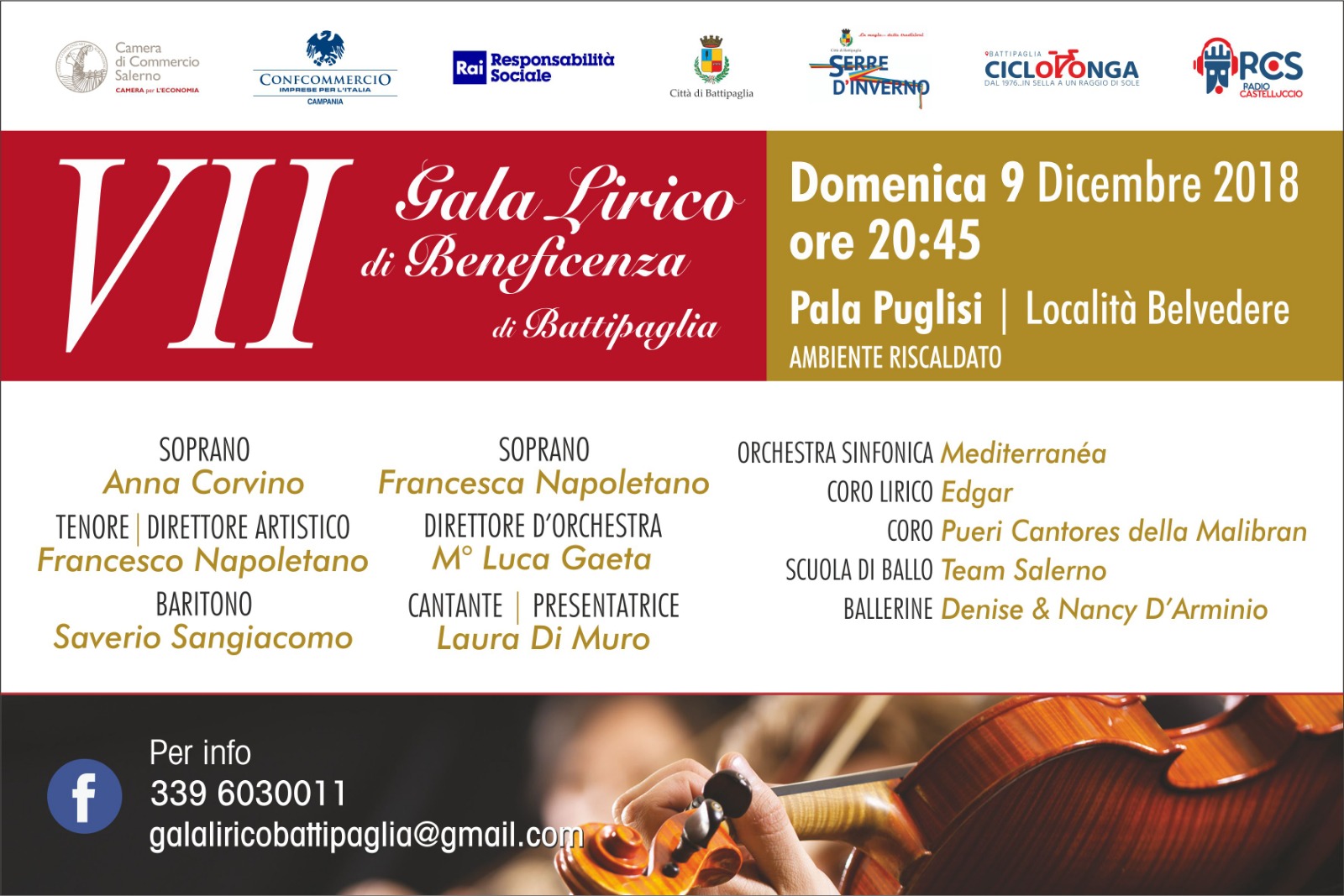 Domenica 9 Dicembre alle ore 20.45 presso il Pala Puglisi di Battipaglia (località Belvedere) si terrà la Settima Edizione del Gala Lirico di Beneficenza di Battipaglia; dunque non più a ridosso del Natale come da tradizione… ma il giorno dopo la Festività dell’Immacolata!