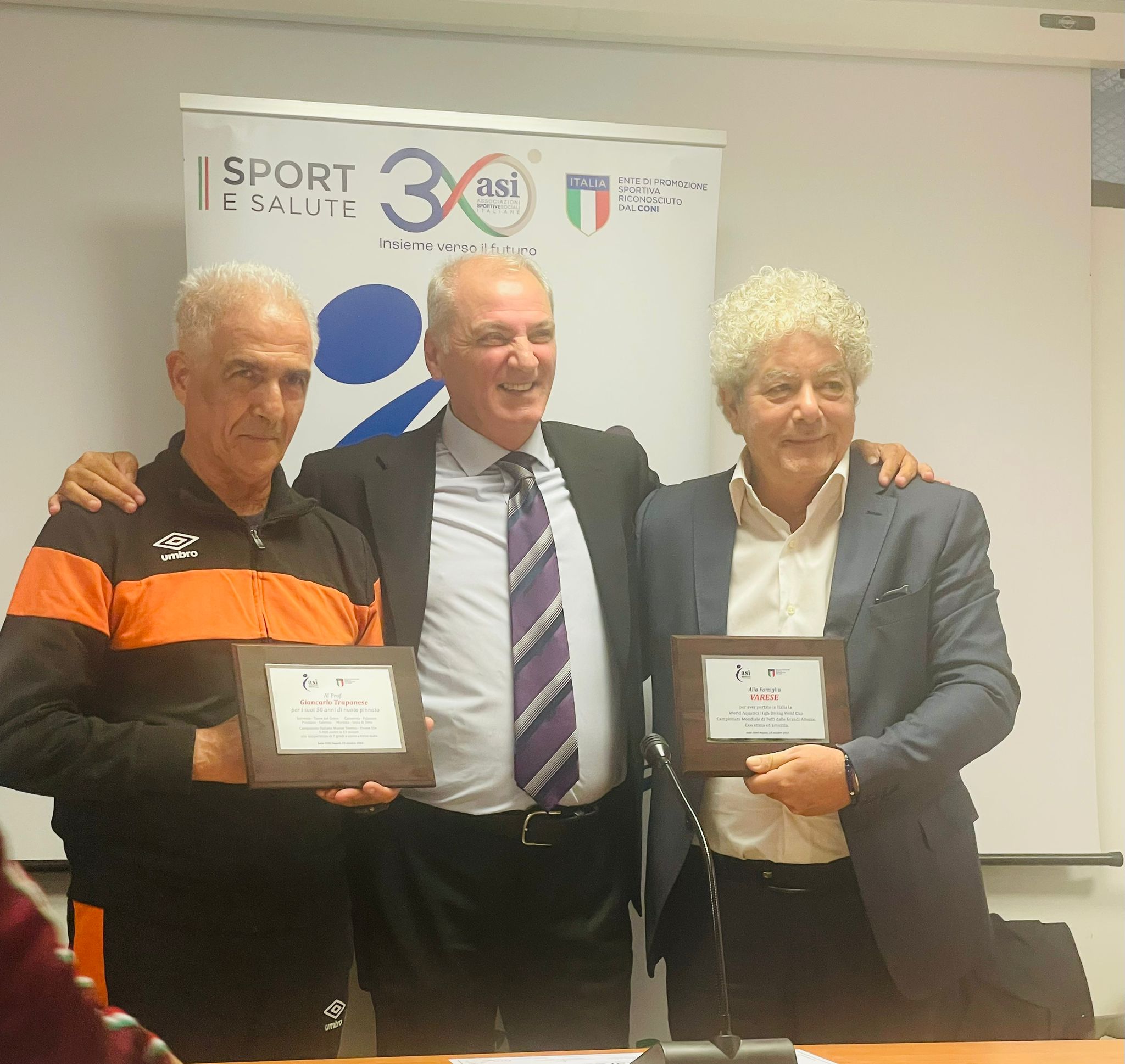 Un riconoscimento è andato anche alla Famiglia Varese, rappresentata da Oreste Varese, per aver portato in Italia la World Aquatics High Diving World Cup, il Campionato Mondiale di Tuffi dalle Grandi Altezze. La targa, dedicata “con stima ed amicizia”, ha voluto sottolineare l’impegno della famiglia nella promozione internazionale degli sport acquatici.