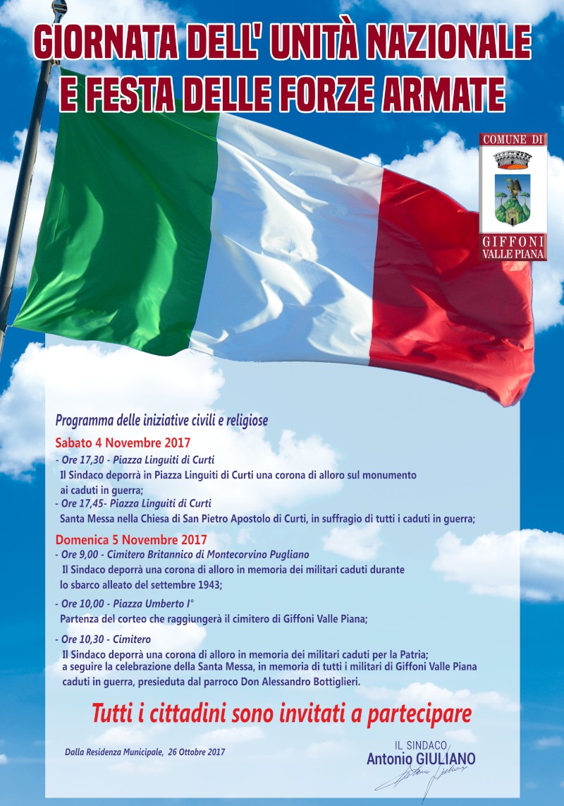 In occasione della Festa dell’Unità Nazionale e delle Forze Armate, l’Amministrazione Comunale commemorerà solennemente la storica ricorrenza attraverso iniziative civili e religiose, secondo il seguente programma: