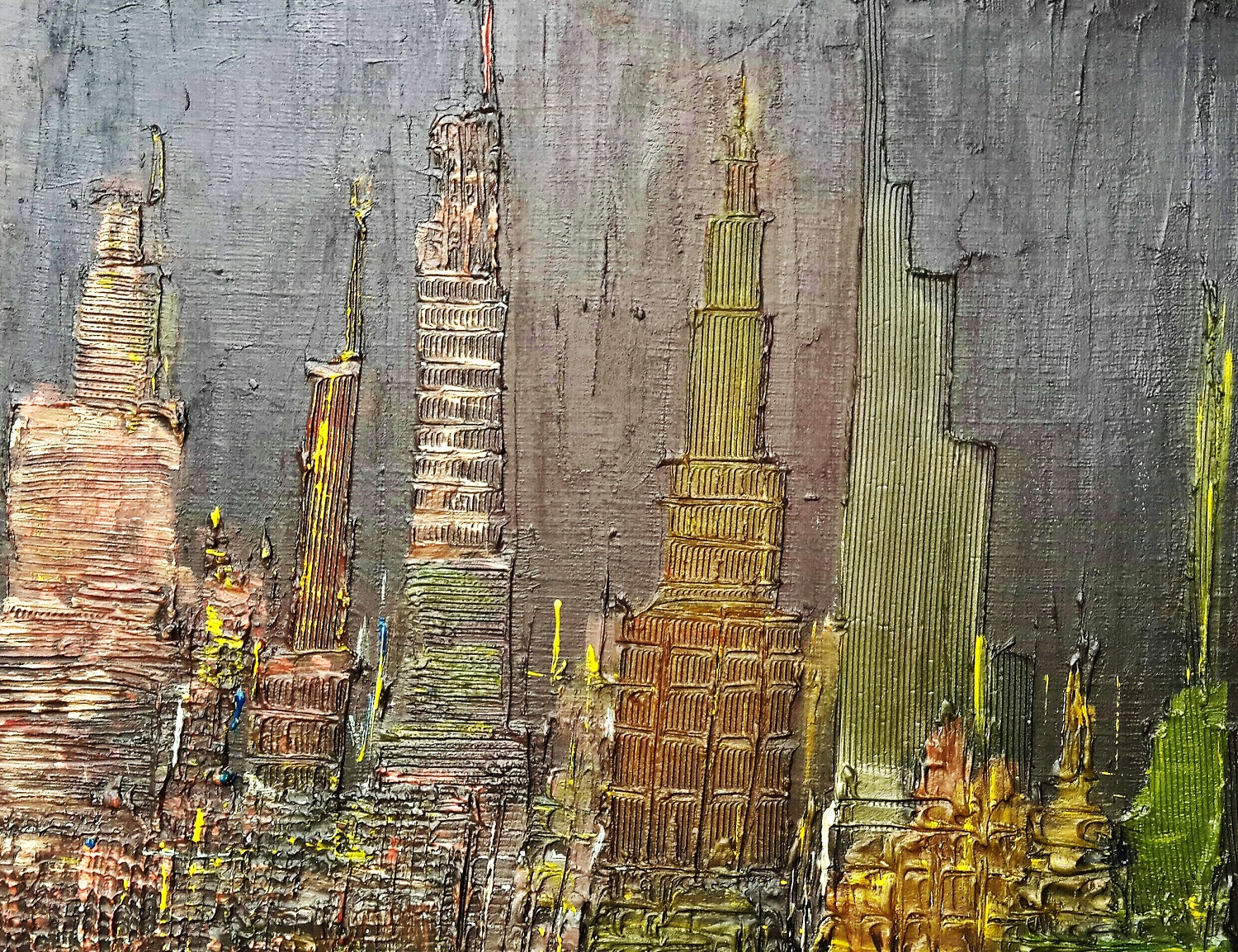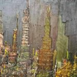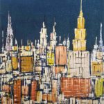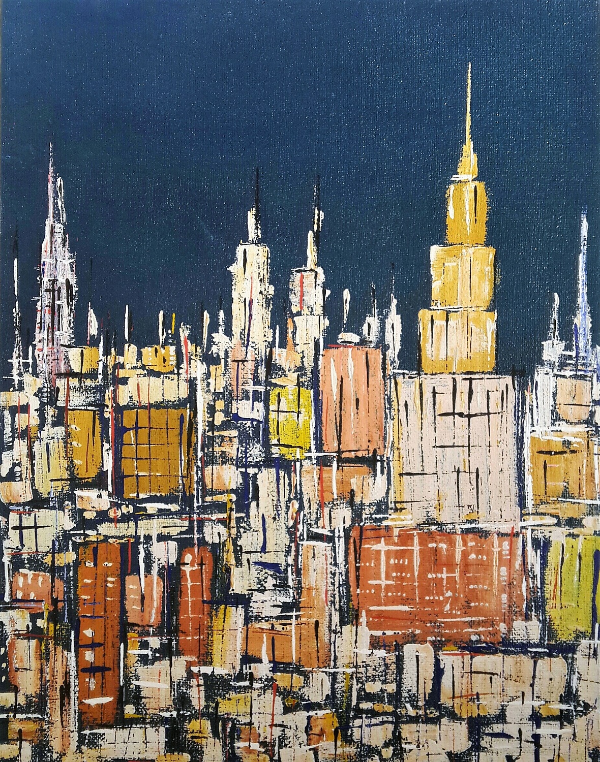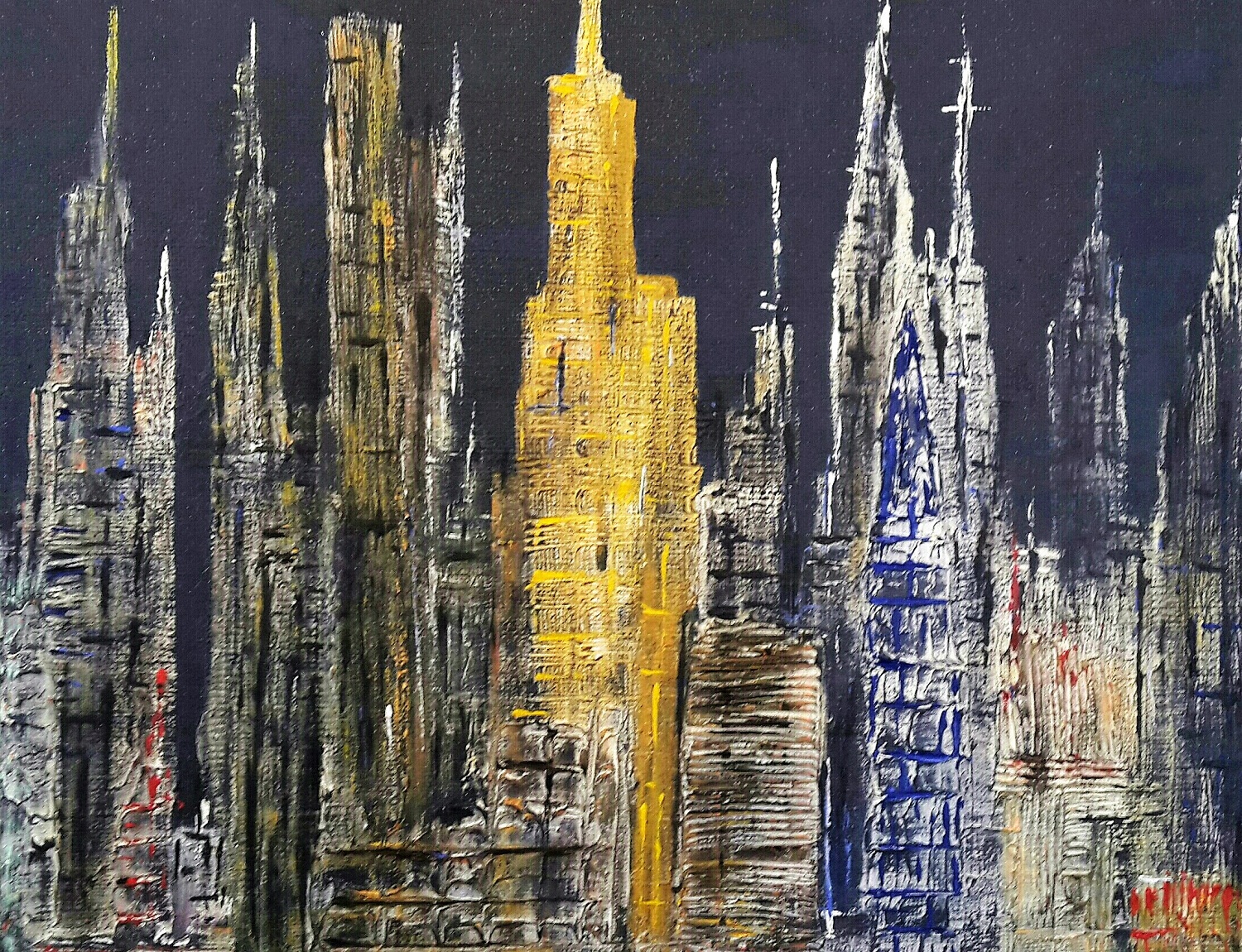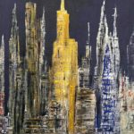 Grattacieli, skyline metropolitani, forme d’acciaio e cemento armato che si ergono svettanti in un moto ascensionale vibrante, vivi e dal tocco impressionista. I dettagli vengono dati da colpi veloci e decisi, tratti brevi ma ugualmente profondi. Non esiste alcuna staticità in queste forme verticali ma emerge il dinamismo e il movimento continuo di città che pullulano di persone, che non ci sono ma che si percepiscono in un gioco di luci ed ombre. Un’umanità invisibile, presente nell’assenza.
