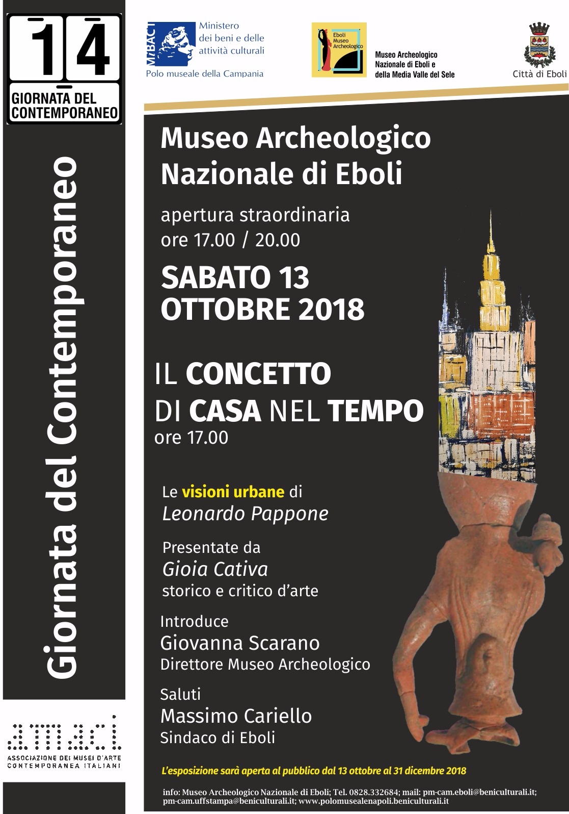 Sabato 13 ottobre 2018 dalle ore 17,00 alle ore 20,00 , presso il Museo archeologico nazionale di Eboli e della media valle del Sele – Polo museale Campania, Archeologia e Contemporaneo, è prevista l’Apertura straordinaria e nell’ambito del “Concetto di casa nel tempo”, Leonardo Pappone “Leopapp” inaugura la sua mostra personale di pittura dal titolo : Visioni Urbane, curata dallo storico e critico d’arte Gioia Cativa.