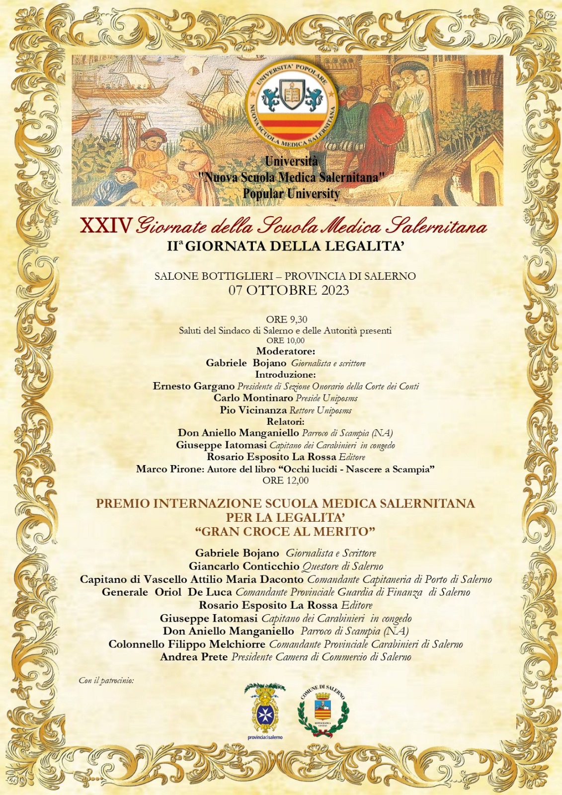 Si aprono il 07 ottobre le XXIV GIORNATE DELLA SCUOLA MEDICA SALERNITANA, con la GIORNATA’ DELLA LEGALITA’ dedicata a coloro che quotidianamente sono impegnati nella lotta alla criminalità organizzata e nel recupero e nella prevenzione dei fenomeni criminosi.