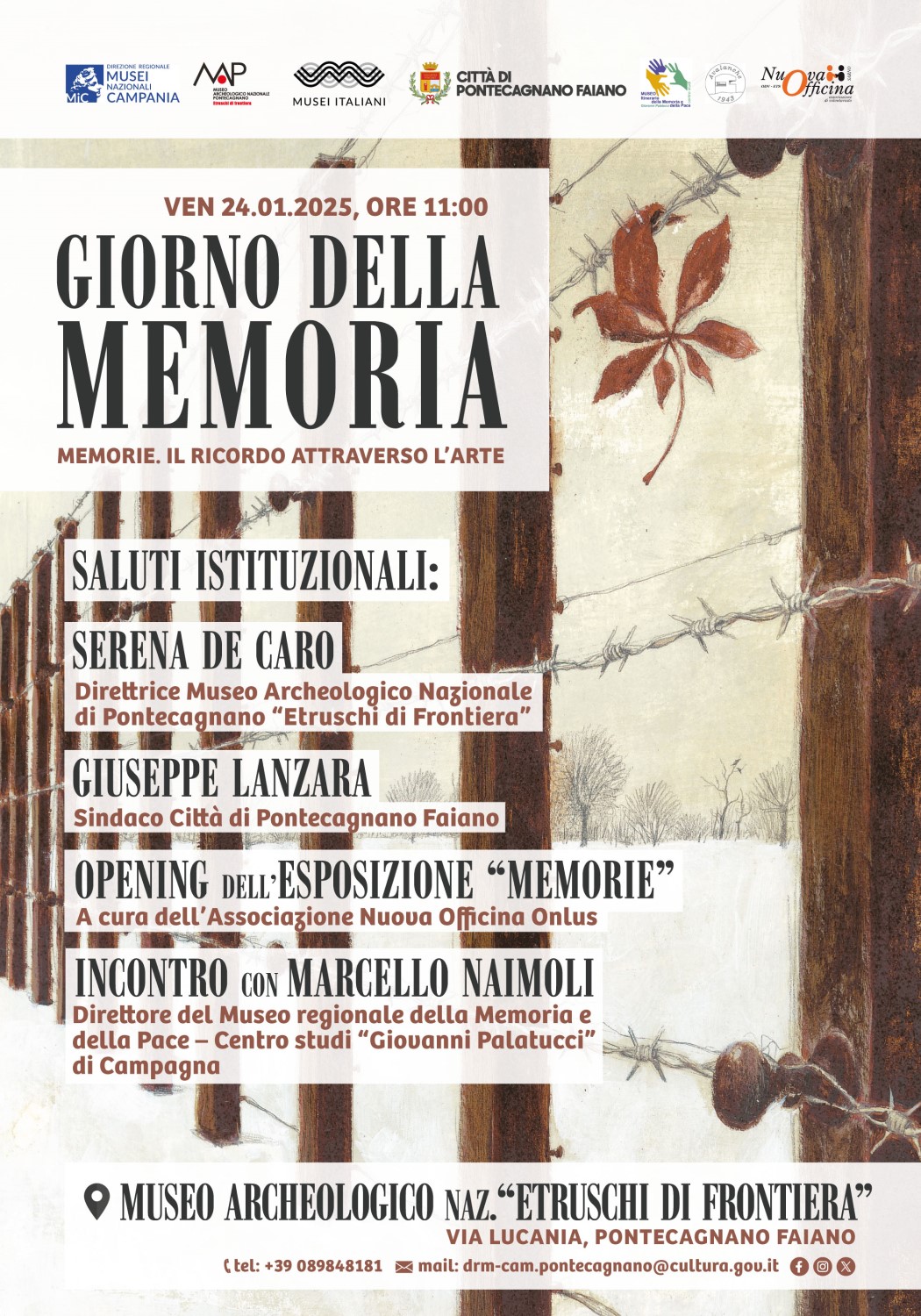 Venerdì 24 Gennaio 2025 alle ore 11.00, in occasione del “Giorno della Memoria”, istituito per commemorare le vittime dell’Olocausto, il Museo archeologico nazionale di Pontecagnano, in collaborazione con il Comune di Pontecagnano Faiano, il Museo regionale della Memoria e della Pace – Centro studi “Giovanni Palatucci”, l’Associazione Nuova Officina onlus e Avalanche 43, ospiterà l’incontro “Memorie. Il ricordo attraverso l’arte”.