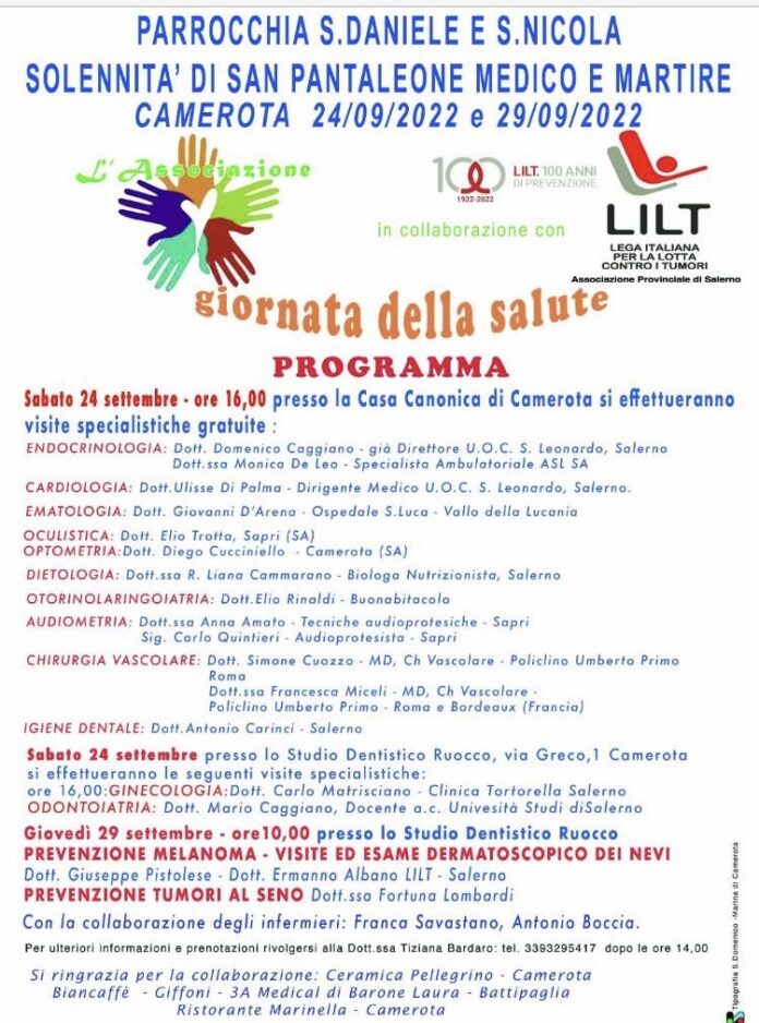 Sono più di venti i medici specialisti che, provenienti da diverse regioni italiane, anche quest’anno non hanno potuto dire no e parteciperanno fino al 28 settembre, a Camerota, ad “Avrò Cura di Te”, l’iniziativa di solidarietà sociale ideata e promossa dal medico, Gianni Ruocco, con il Vicepresidente del Comitato organizzatore, Giovanni D’Arena ed il Parroco Don Antonio Torello, in omaggio a San Pantaleone. L’iniziativa che si svolge in collaborazione con Lilt (Lega Italiana per la lotta contro i tumori- Associazione provinciale di Salerno) e Rotary Club Costiera Amalfitana, ormai dal 2014 trasforma musei ed altre strutture, per alcuni giorni, in ambulatori medici in cui i professionisti devolvono gratuitamente le loro prestazioni ai pazienti, con priorità ai più bisognosi, che ne fanno richiesta. L’edizione 2024, la dodicesima, si svolge dal 26 al 28 settembre nei locali della Casa Canonica, del Museo Civico e dello studio dentistico Ruocco, a Camerota.