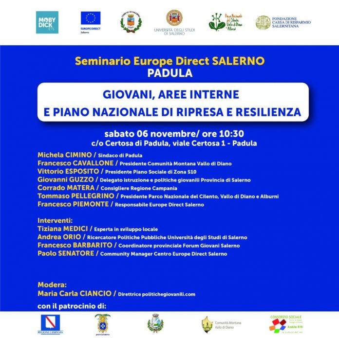 Si terrà sabato 6 novembre 2021 alle ore 10.30, presso la prestigiosa location della Certosa, il sesto seminario zonale organizzato da Europe Direct Salerno in collaborazione con il Comune di Padula.