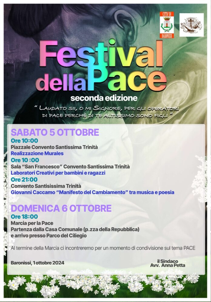 “Siamo orgogliosi di ospitare un artista sensibile e attento alle dinamiche giovanili come Giovanni Caccamo – sottolinea il Sindaco Anna Petta – Abbiamo pensato subito a lui per il Festival della Pace, perché con la sua musica e i suoi testi, riesce ad interpretare la visione della grande mobilitazione pacifista, all’insegna del dialogo, dell’incontro, per una rivoluzione culturale con un impatto positivo sul futuro. Giovanni è un artista poliedrico, cantautore ma anche intellettuale ispirato. Ha scritto un libro bellissimo che si intitola “Manifesto del Cambiamento. Parola ai giovani”, una raccolta di 60 testimonianze che lui si augura “possano aiutare chiunque si trovi in un periodo di impasse a ritrovare la bussola interiore riuscendo a essere scintilla di un cambiamento”. È un vero manifesto culturale che vede i giovani in prima fila, quei giovani che sono il nostro futuro e che hanno diritto ad accendere i loro sogni. Un manifesto che sottolinea l’importanza di un “nuovo Umanesimo”. E davvero in questo momento storico abbiamo bisogno di un ponte tra intellettuali e politica per costruire questo: una società migliore, più giusta, che ritrovi la sua empatia, andata un po’ perduta. E che guardi al futuro con coraggio, come solo i giovani sanno fare”.