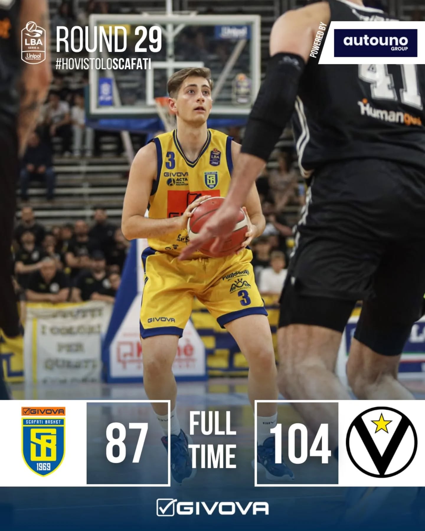 Gli ultimi e non decisivi dieci minuti di contesa si aprono con la giocata da tre punti di Pinkins che segna, subisce fallo e converte dalla lunetta a cronometro fermo (59-88). Gli ospiti lanciano sul parquet il giovanissimo Accorsi (classe 2007), Scafati risponde con la grinta e l’orgoglio di un mai domo Cinciarini, una volta di più ultimo ad arrendersi per i suoi e capace di mettere in ritmo anche i compagni. La Givova si riporta a -18 (75-93 con meno di cinque minuti da giocare) costringendo coach Ivanovic alla sospensione. La strigliata del tecnico virtussino serve eccome ai suoi: controbreak di 0-6 propiziato da Morgan e Zizic e risposta da grande squadra per gli ospiti che non devono far altro che amministrare l’ampio vantaggio a disposizione. Scafati, d’altro canto, chiude alla grande gli ultimi scampoli di gara: il giovanissimo Sangiovanni realizza due triple che sanciscono l’87-104 finale.