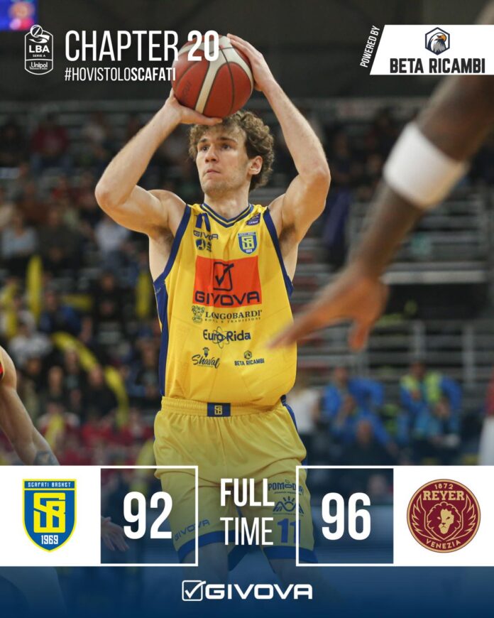 Il quinto supplementare della stagione scafatese non premia gli uomini di coach Ramondino, sconfitti 92-96 dall’Umana Reyer Venezia di Ennis (24 punti e 9 assist) e Kabengele (22 punti ed 11 rimbalzi). Il grande sforzo prodotto da Maxhuni (25 punti in 19 minuti di impiego) e compagni consente alla Givova di toccare il +5 a 2:43 dal termine del primo tempo supplementare (92-87), ma non riesce a contrapporsi all’ultimo, decisivo, break dei lagunari. Il 62% da 2 punti degli ospiti a fronte del solo 43% dei padroni di casa ed il diverso effort a rimbalzo (47 a 34 per gli orogranata) risultano fondamentali nel quarto tempo supplementare perso da Scafati sui cinque disputati.