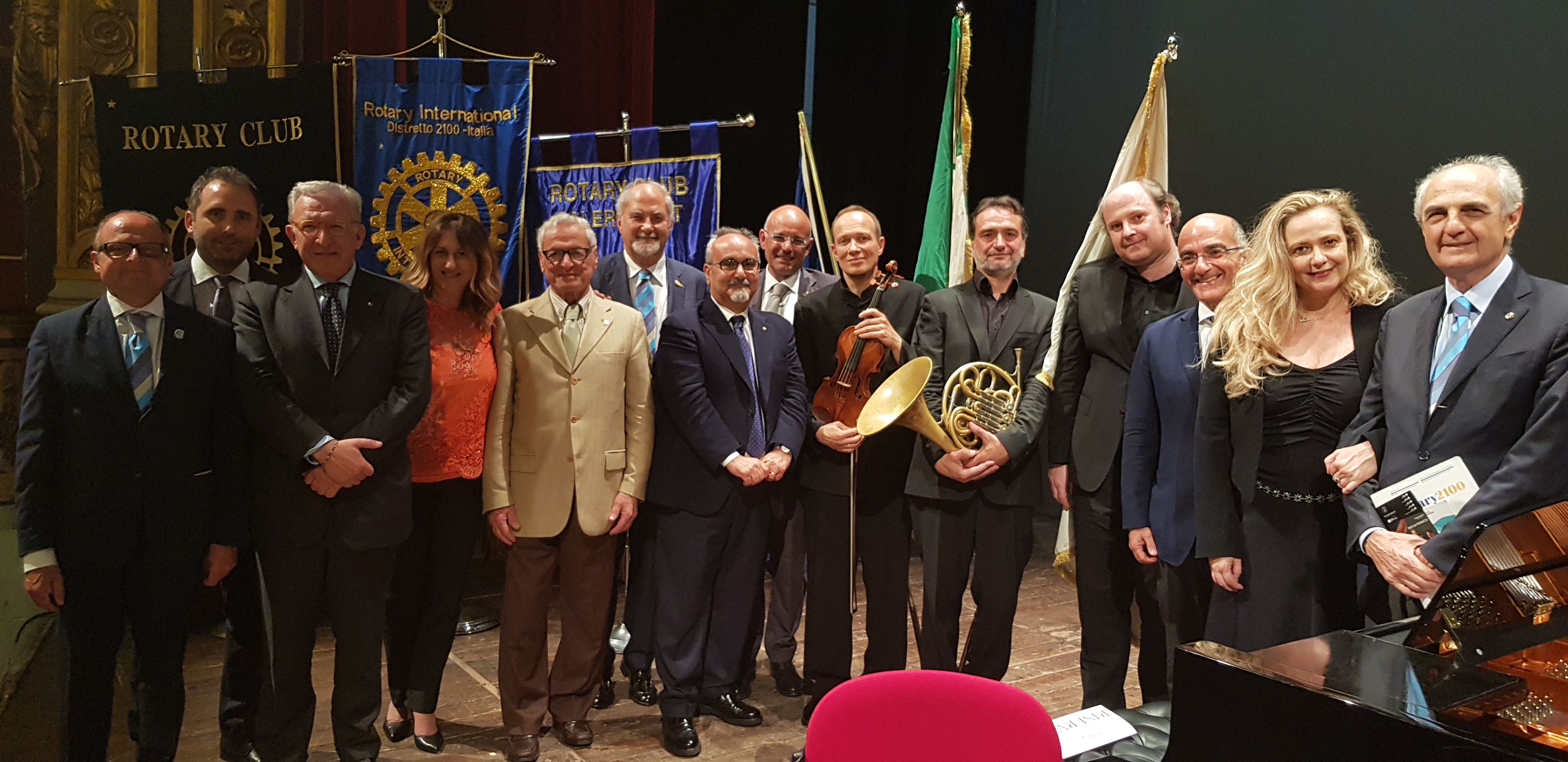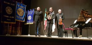 La prima parte del concerto è iniziata con l’esecuzione de “La Grande Fanfara”, di Gioacchino Rossini eseguita nell’interpretazione del Maestro Alessio Allegrini, trascritta in Mi bemolle, per corno solo; è proseguita con brani di Elgar e Saens, eseguiti dai maestri Oliver Kern al pianoforte (un Bösendorfer fornito dalla ditta Arena del valore di 170mila euro), e Francesco Manara al violino,( un Nicola Amati del 1665) e la sonata n.2 in Fa maggiore di Luigi Cherubini eseguita da Kern e Allegrini. Il Maestro Kern dopo aver eseguito altri tre brani ha concluso con l’esecuzione de “La Ballata” di Chopin dedicata al grande Maestro Marco Giovanetti, ex Direttore del Conservatorio di Bergamo, scomparso pochi giorni fa. Nella seconda parte del concerto il trio ha eseguito l’Opera 40 di Johannes Brahms che ha scatenato l’entusiasmo del pubblico che, dopo una standing ovation, ha richiesto il bis. Dopo gli inni e la sfilata delle bandiere: d’Italia, d’Europa e del Rotary, portate dalle giovanissime rotariane del Rotaract e dell’Interact: Livia Corrente, Mariachiara Maiurano, Valentina Autuori, Valeria Autieri, Giulia Celletti, Noemi Ferrara; e la proiezione di due video che spiegavano la missione del Rotary (realizzato dal dottor Mario Petraglia) e il progetto internazionale della “Polio Plus”, il Governatore del Distretto Rotary 2100, l’ingegner Salvatore Iovieno, che ha fortemente voluto che si organizzasse questo evento, ha spiegato che dal 1985 i Club Rotary di tutto il mondo sono impegnati nel progetto “Polio Plus”:” Ha contribuito a ridurre i casi di polio di oltre il 99,9 %. Dai 350mila casi che c’erano nel mondo ogni anno, siamo arrivati a 20 casi in quei paesi dove ancora ci sono dei focolai. Il Rotary ogni anno, per tre anni, deve raccogliere 50 milioni di dollari per poter beneficiare dell’aiuto della Fondazione Bill & Melinda Gates che per ogni dollaro raccolto dai rotariani ne mette due a disposizione. Questo grande progetto probabilmente si chiuderà il prossimo anno. Manca così poco perché nessun bambino debba soffrire per questa malattia debilitante”. Promotori del concerto sono stati i Club Rotary della nostra città: Rotary Club Salerno Est, presieduto dall’avvocato Carmine Napoli, rappresentato dal Vice Presidente Antonio Brando, che ha portato “con gioia” i saluti di tutti i presidenti e i soci dei Club; Rotary Club Salerno A.F.1949, presieduto dal dottor Vincenzo Caliendo, rappresentato dal Past President Mario Petraglia; Rotary Salerno Duomo, presieduto dal dottor Michele Pellegrino; Rotary Salerno Nord Due Principati, presieduto dalla professoressa Sirella Renda; Rotary Salerno Picentia, presieduto dal dottor Roberto Napoli, che hanno organizzato l’evento in collaborazione con il Comune di Salerno; con l’Associazione Culturale e Musicale “Baronissi Europa Festival”, presieduta dalla professoressa Serafina Sabatino, con la “Banca Monte Pruno”, Partner Unico, diretta dal dottor Michele Albanese, che ha lodato l’iniziativa:” Anche quest’anno abbiamo partecipato a quest’ iniziativa di solidarietà che unisce tutti in un’unica rete che agisce in forma sinergica. Noi siamo una banca del territorio che crede molto nella solidarietà: è un modo per restituire al territorio ciò che il territorio ci dà”. I tre musicisti del “Trio di Monaco” sono impegnati da anni anche in ambito sociale:” Si sono esibiti in vari concerti a scopo umanitario in tutto il mondo. Sostengono che la musica debba essere uno strumento per tutelare i diritti umani, sociali e civili” ha spiegato la musicologa Serafina Sabatino, Direttore Artistico della serata, che ha spiegato quelli che sono gli obiettivi dell’associazione da lei presieduta: ” L’Associazione “Baronissi Europa Festival” che è itinerante e collegata con varie associazioni italiane ed europee: promuove lo sviluppo della realtà artistico – musicale del territorio campano che è veramente eccezionale. Nella musica d’arte ci sono le radici storiche, culturali, artistiche, che rappresentano il nostro patrimonio culturale occidentale ed europeo che rappresentano la base da cui partire per poter trovare un’identità europea condivisa”. ”. Nella mattinata di lunedì sempre al Teatro Verdi, c’è stata una lezione – concerto riservata agli alunni degli istituti a indirizzo musicale del territorio durante la quale i maestri Kern e Allegrini hanno dato alcuni importanti consigli agli allievi del Conservatorio di Avellino e di Salerno accompagnati dai maestri Lucio Grimaldi e Massimo Trotta. Tutta la manifestazione è stata coordinata dall’Assistente del Governatore, l’avvocato Andrea Di Lieto, dal Past President del Rotary Club Salerno Est, l’ingegner Achille Parisi e dal Maestro Sergio Martinoli, Vice Presidente dell’associazione “Baronissi Europa Festival”.