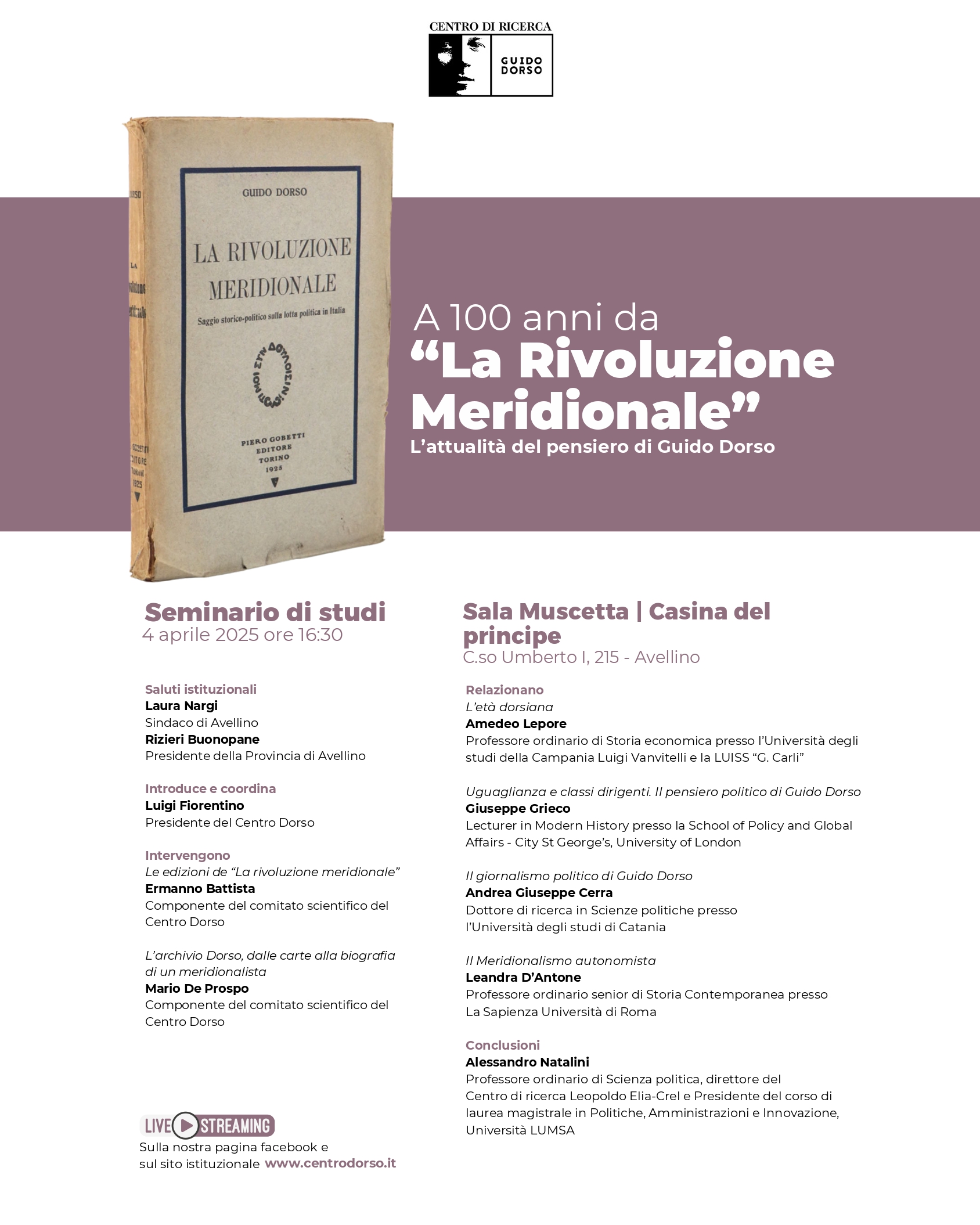L’evento sarà trasmesso in diretta streaming sulla pagina Facebook del Centro Dorso e sul sito ufficiale: https://www.centrodorso.it.