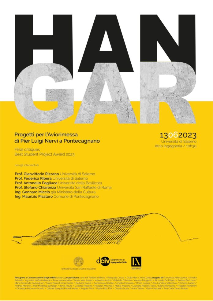 Il giorno martedì 13 giugno 2023 a partire dalle ore 10.30 si terrà presso l’Atrio di Ingegneria (Edificio E) del Dipartimento di Ingegneria Civile dell’Università degli Studi di Salerno, l’esposizione “HANGAR. Progetti per l’Aviorimessa di Pier Luigi Nervi a Pontecagnano”.