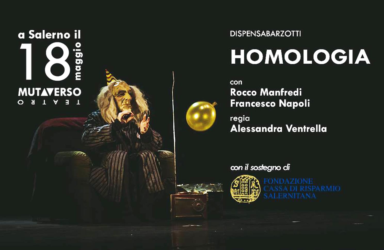 Si chiude con Homologia, della compagnia DispensaBarzotti, venerdì 18 maggio alle ore 21 la terza edizione della stagione teatrale salernitana Mutaverso Teatro, sostenuta dal Comune di Salerno e, tra gli altri, dalla Fondazione CARISAL Cassa di Risparmio Salernitana. La compagnia fa ritorno all’Auditorium Centro Sociale (Salerno, via Cantarella 22) dopo il successo dello spettacolo Victor presentato lo scorso febbraio.