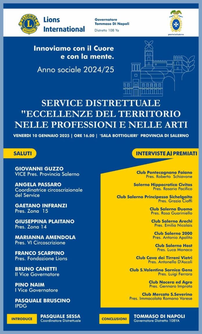 È in programma venerdì 10 gennaio alle ore 16.00, presso la Sala Bottiglieri della Provincia di Salerno, il Service distrettuale Lions “Eccellenze del territorio nelle professioni e nelle arti”. Organizzato da alcuni anni nella città di Salerno dai club della VI circoscrizione, con il patrocinio della Provincia di Salerno, l’appuntamento si conferma come un momento di incontro tra la cittadinanza e le “eccellenze” dei diversi ambiti professionali, esponenti del territorio che si sono particolarmente distinti per la loro professionalità.